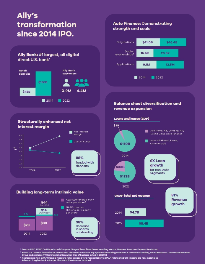 Despite economic and market challenges in 2022, prudent risk management, multi-factor decision making and a long-term view allowed Ally to continue achieving operational successes while also generating record net interest margin and total revenue. These actions also contributed to our resiliency during the first quarter of 2023, when the banking sector experienced significant turbulence in the wake of the failures of Silicon Valley Bank and Signature Bank. The value of our execution on strategic objectives has been evident, with core-funding through sticky and stable retail deposits as well as strong levels of liquidity and capital. And even though cautious actions since the beginning of 2022 around risk management and capital allocation (such as tightened underwriting and a pause in share repurchases) may pressure near-term earnings, we are positioned for meaningful earnings expansion longer-term.
