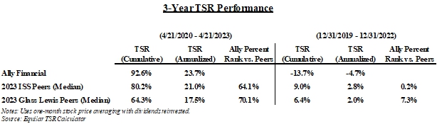 At the Ally 2023 Annual Meeting of Stockholders to be held on May 3, 2023, you are being asked to vote, on an advisory, non-binding basis, on a resolution to approve the compensation paid to our NEOs as disclosed in our 2023 proxy statement. Please see Proposal 2 (Say-on-Pay). We want to provide further context and detail on our compensation program and philosophy and hope that you consider the following information before you vote your shares. We recommend that stockholders vote “FOR” Proposal 2.