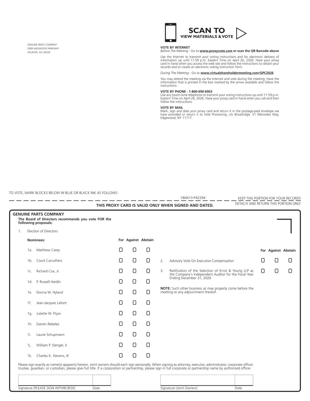 Signature [PLEASE SIGN WITHIN BOX] Date Signature (Joint Owners) Date TO VOTE, MARK BLOCKS BELOW IN BLUE OR BLACK INK AS FOLLOWS: KEEP THIS PORTION FOR YOUR RECORDS DETACH AND RETURN THIS PORTION ONLYTHIS PROXY CARD IS VALID ONLY WHEN SIGNED AND DATED. V84413-P42294 For Against Abstain For Against Abstain ! !! ! !! ! !! ! !! ! !! ! !! ! !! ! !! ! !! ! !! ! !! ! !! Nominees: 2. Advisory Vote On Executive Compensation 3. Ratification of the Selection of Ernst & Young LLP as the Company's Independent Auditor for the Fiscal Year Ending December 31, 2026 1. Election of Directors GENUINE PARTS COMPANY The Board of Directors recommends you vote FOR the following proposals: 1a. Matthew Carey 1b. Court Carruthers 1c. Richard Cox, Jr. 1d. P. Russell Hardin 1e. Donna W. Hyland 1f. Jean-Jacques Lafont 1g. Juliette W. Pryor 1h. Darren Rebelez 1i. Laurie Schupmann 1j. William P. Stengel, II 1k. Charles K. Stevens, III Please sign exactly as name(s) appear(s) hereon. Joint owners should each sign personally. When signing as attorney, executor, administrator, corporate officer, trustee, guardian, or custodian, please give full title. If a corporation or partnership, please sign in full corporate or partnership name by authorized officer. NOTE: Such other business as may properly come before the meeting or any adjournment thereof. ! ! ! SCAN TO VIEW MATERIALS & VOTEw GENUINE PARTS COMPANY 2999 WILDWOOD PARKWAY ATLANTA, GA 30339 VOTE BY INTERNET Before The Meeting - Go to www.proxyvote.com or scan the QR Barcode above Use the Internet to transmit your voting instructions and for electronic delivery of information up until 11:59 p.m. Eastern Time on April 26, 2026. Have your proxy card in hand when you access the web site and follow the instructions to obtain your records and to create an electronic voting instruction form. During The Meeting - Go to www.virtualshareholdermeeting.com/GPC2026 You may attend the meeting via the Internet and vote during the meeting. Have the information that is printed in the box marked by the arrow available and follow the instructions. VOTE BY PHONE - 1-800-690-6903 Use any touch-tone telephone to transmit your voting instructions up until 11:59 p.m. Eastern Time on April 26, 2026. Have your proxy card in hand when you call and then follow the instructions. VOTE BY MAIL Mark, sign and date your proxy card and return it in the postage-paid envelope we have provided or return it to Vote Processing, c/o Broadridge, 51 Mercedes Way, Edgewood, NY 11717.