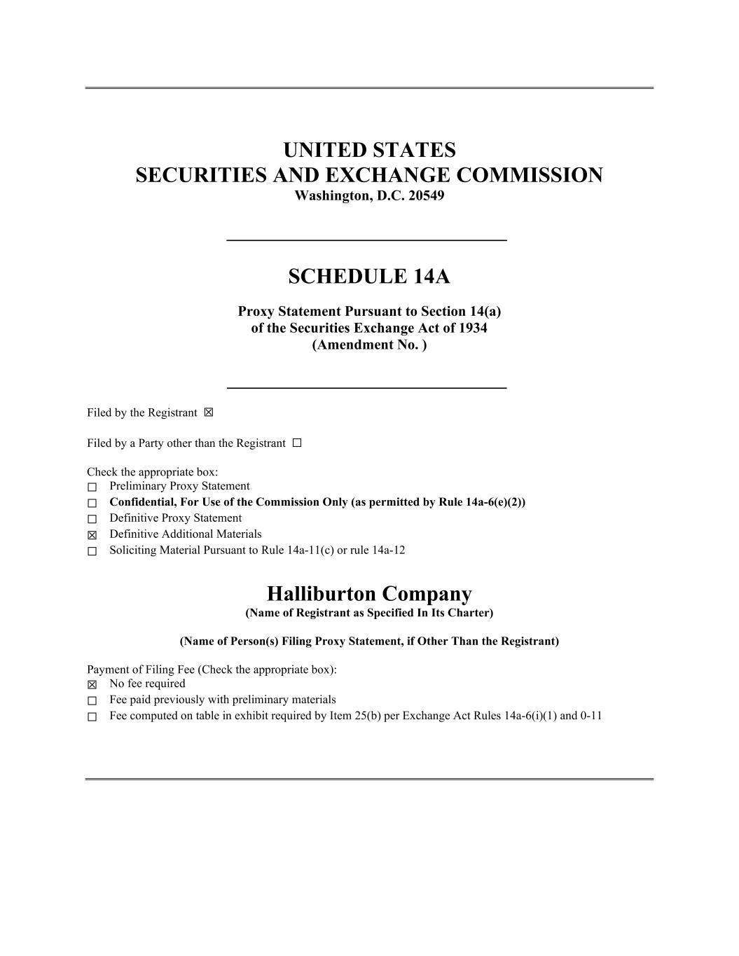 UNITED STATES SECURITIES AND EXCHANGE COMMISSION Washington, D.C. 20549 SCHEDULE 14A Proxy Statement Pursuant to Section 14(a) of the Securities Exchange Act of 1934 (Amendment No. ) Filed by the Registrant ☒ Filed by a Party other than the Registrant ☐ Check the appropriate box: ☐ Preliminary Proxy Statement ☐ Confidential, For Use of the Commission Only (as permitted by Rule 14a-6(e)(2)) ☐ Definitive Proxy Statement ☒ Definitive Additional Materials ☐ Soliciting Material Pursuant to Rule 14a-11(c) or rule 14a-12 Halliburton Company (Name of Registrant as Specified In Its Charter) (Name of Person(s) Filing Proxy Statement, if Other Than the Registrant) Payment of Filing Fee (Check the appropriate box): ☒ No fee required ☐ Fee paid previously with preliminary materials ☐ Fee computed on table in exhibit required by Item 25(b) per Exchange Act Rules 14a-6(i)(1) and 0-11