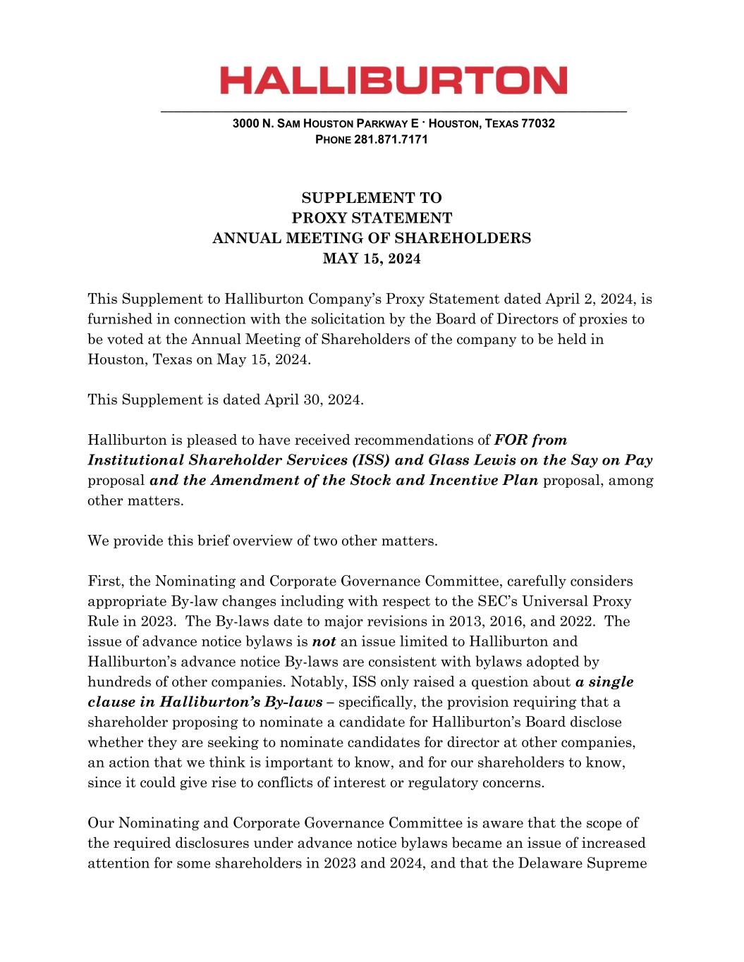 ______________________________________________________________________ 3000 N. SAM HOUSTON PARKWAY E · HOUSTON, TEXAS 77032 PHONE 281.871.7171 SUPPLEMENT TO PROXY STATEMENT ANNUAL MEETING OF SHAREHOLDERS MAY 15, 2024 This Supplement to Halliburton Company’s Proxy Statement dated April 2, 2024, is furnished in connection with the solicitation by the Board of Directors of proxies to be voted at the Annual Meeting of Shareholders of the company to be held in Houston, Texas on May 15, 2024. This Supplement is dated April 30, 2024. Halliburton is pleased to have received recommendations of FOR from Institutional Shareholder Services (ISS) and Glass Lewis on the Say on Pay proposal and the Amendment of the Stock and Incentive Plan proposal, among other matters. We provide this brief overview of two other matters. First, the Nominating and Corporate Governance Committee, carefully considers appropriate By-law changes including with respect to the SEC’s Universal Proxy Rule in 2023. The By-laws date to major revisions in 2013, 2016, and 2022. The issue of advance notice bylaws is not an issue limited to Halliburton and Halliburton’s advance notice By-laws are consistent with bylaws adopted by hundreds of other companies. Notably, ISS only raised a question about a single clause in Halliburton’s By-laws – specifically, the provision requiring that a shareholder proposing to nominate a candidate for Halliburton’s Board disclose whether they are seeking to nominate candidates for director at other companies, an action that we think is important to know, and for our shareholders to know, since it could give rise to conflicts of interest or regulatory concerns. Our Nominating and Corporate Governance Committee is aware that the scope of the required disclosures under advance notice bylaws became an issue of increased attention for some shareholders in 2023 and 2024, and that the Delaware Supreme