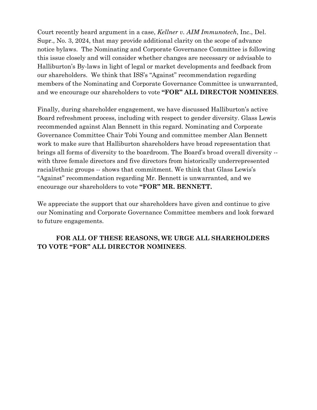 Court recently heard argument in a case, Kellner v. AIM Immunotech, Inc., Del. Supr., No. 3, 2024, that may provide additional clarity on the scope of advance notice bylaws. The Nominating and Corporate Governance Committee is following this issue closely and will consider whether changes are necessary or advisable to Halliburton’s By-laws in light of legal or market developments and feedback from our shareholders. We think that ISS’s “Against” recommendation regarding members of the Nominating and Corporate Governance Committee is unwarranted, and we encourage our shareholders to vote “FOR” ALL DIRECTOR NOMINEES. Finally, during shareholder engagement, we have discussed Halliburton’s active Board refreshment process, including with respect to gender diversity. Glass Lewis recommended against Alan Bennett in this regard. Nominating and Corporate Governance Committee Chair Tobi Young and committee member Alan Bennett work to make sure that Halliburton shareholders have broad representation that brings all forms of diversity to the boardroom. The Board’s broad overall diversity -- with three female directors and five directors from historically underrepresented racial/ethnic groups -- shows that commitment. We think that Glass Lewis’s “Against” recommendation regarding Mr. Bennett is unwarranted, and we encourage our shareholders to vote “FOR” MR. BENNETT. We appreciate the support that our shareholders have given and continue to give our Nominating and Corporate Governance Committee members and look forward to future engagements. FOR ALL OF THESE REASONS, WE URGE ALL SHAREHOLDERS TO VOTE “FOR” ALL DIRECTOR NOMINEES.