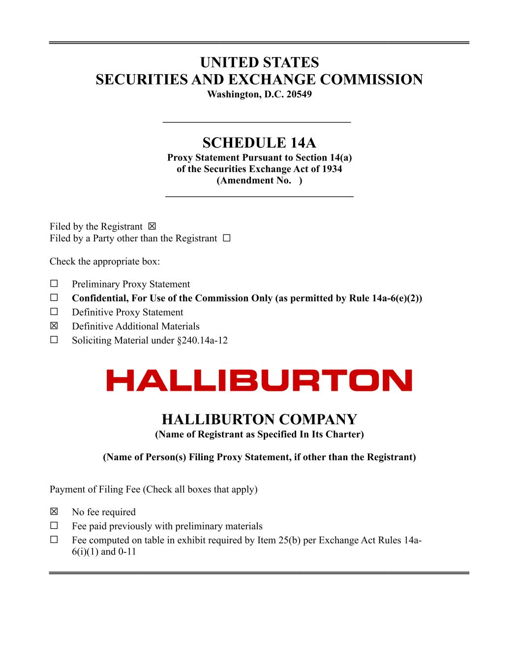 UNITED STATES SECURITIES AND EXCHANGE COMMISSION Washington, D.C. 20549 _____________________________________ SCHEDULE 14A Proxy Statement Pursuant to Section 14(a) of the Securities Exchange Act of 1934 (Amendment No. ) _____________________________________ Filed by the Registrant ☒ Filed by a Party other than the Registrant ☐ Check the appropriate box: ☐ Preliminary Proxy Statement ☐ Confidential, For Use of the Commission Only (as permitted by Rule 14a-6(e)(2)) ☐ Definitive Proxy Statement ☒ Definitive Additional Materials ☐ Soliciting Material under §240.14a-12 HALLIBURTON COMPANY (Name of Registrant as Specified In Its Charter) (Name of Person(s) Filing Proxy Statement, if other than the Registrant) Payment of Filing Fee (Check all boxes that apply) ☒ No fee required ☐ Fee paid previously with preliminary materials ☐ Fee computed on table in exhibit required by Item 25(b) per Exchange Act Rules 14a- 6(i)(1) and 0-11