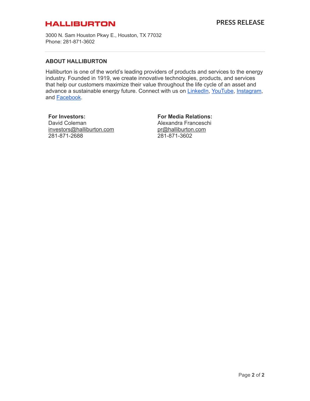 PRESS RELEASE 3000 N. Sam Houston Pkwy E., Houston, TX 77032 Phone: 281-871-3602 Page 2 of 2 ABOUT HALLIBURTON Halliburton is one of the world’s leading providers of products and services to the energy industry. Founded in 1919, we create innovative technologies, products, and services that help our customers maximize their value throughout the life cycle of an asset and advance a sustainable energy future. Connect with us on LinkedIn, YouTube, Instagram, and Facebook. For Investors: David Coleman investors@halliburton.com 281-871-2688 For Media Relations: Alexandra Franceschi pr@halliburton.com 281-871-3602