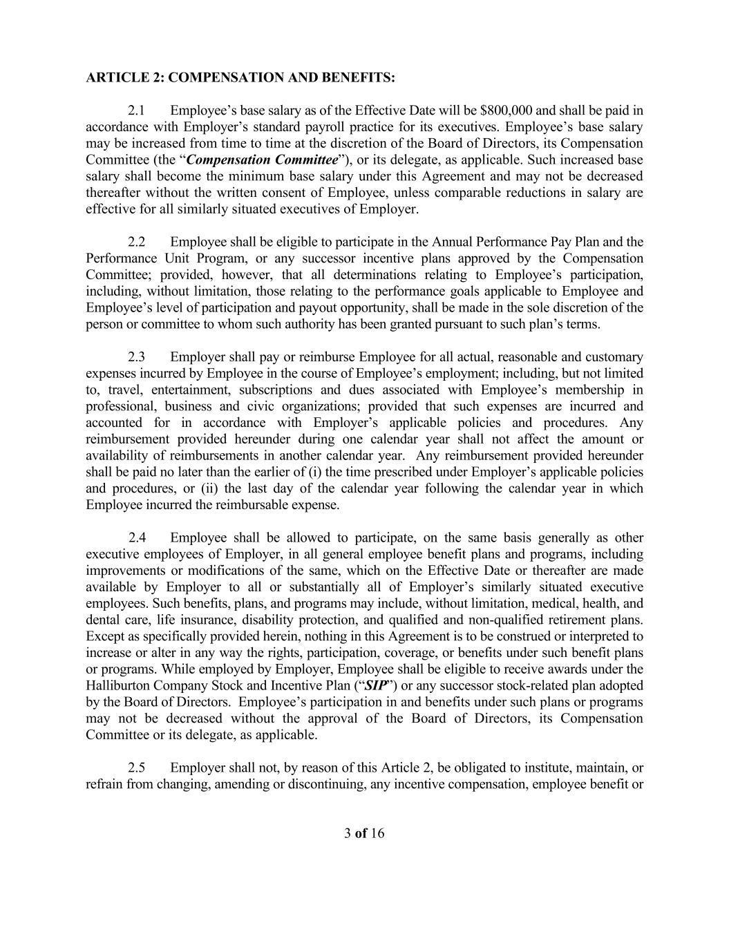 3 of 16 ARTICLE 2: COMPENSATION AND BENEFITS: 2.1 Employee’s base salary as of the Effective Date will be $800,000 and shall be paid in accordance with Employer’s standard payroll practice for its executives. Employee’s base salary may be increased from time to time at the discretion of the Board of Directors, its Compensation Committee (the “Compensation Committee”), or its delegate, as applicable. Such increased base salary shall become the minimum base salary under this Agreement and may not be decreased thereafter without the written consent of Employee, unless comparable reductions in salary are effective for all similarly situated executives of Employer. 2.2 Employee shall be eligible to participate in the Annual Performance Pay Plan and the Performance Unit Program, or any successor incentive plans approved by the Compensation Committee; provided, however, that all determinations relating to Employee’s participation, including, without limitation, those relating to the performance goals applicable to Employee and Employee’s level of participation and payout opportunity, shall be made in the sole discretion of the person or committee to whom such authority has been granted pursuant to such plan’s terms. 2.3 Employer shall pay or reimburse Employee for all actual, reasonable and customary expenses incurred by Employee in the course of Employee’s employment; including, but not limited to, travel, entertainment, subscriptions and dues associated with Employee’s membership in professional, business and civic organizations; provided that such expenses are incurred and accounted for in accordance with Employer’s applicable policies and procedures. Any reimbursement provided hereunder during one calendar year shall not affect the amount or availability of reimbursements in another calendar year. Any reimbursement provided hereunder shall be paid no later than the earlier of (i) the time prescribed under Employer’s applicable policies and procedures, or (ii) the last day of the calendar year following the calendar year in which Employee incurred the reimbursable expense. 2.4 Employee shall be allowed to participate, on the same basis generally as other executive employees of Employer, in all general employee benefit plans and programs, including improvements or modifications of the same, which on the Effective Date or thereafter are made available by Employer to all or substantially all of Employer’s similarly situated executive employees. Such benefits, plans, and programs may include, without limitation, medical, health, and dental care, life insurance, disability protection, and qualified and non-qualified retirement plans. Except as specifically provided herein, nothing in this Agreement is to be construed or interpreted to increase or alter in any way the rights, participation, coverage, or benefits under such benefit plans or programs. While employed by Employer, Employee shall be eligible to receive awards under the Halliburton Company Stock and Incentive Plan (“SIP”) or any successor stock-related plan adopted by the Board of Directors. Employee’s participation in and benefits under such plans or programs may not be decreased without the approval of the Board of Directors, its Compensation Committee or its delegate, as applicable. 2.5 Employer shall not, by reason of this Article 2, be obligated to institute, maintain, or refrain from changing, amending or discontinuing, any incentive compensation, employee benefit or