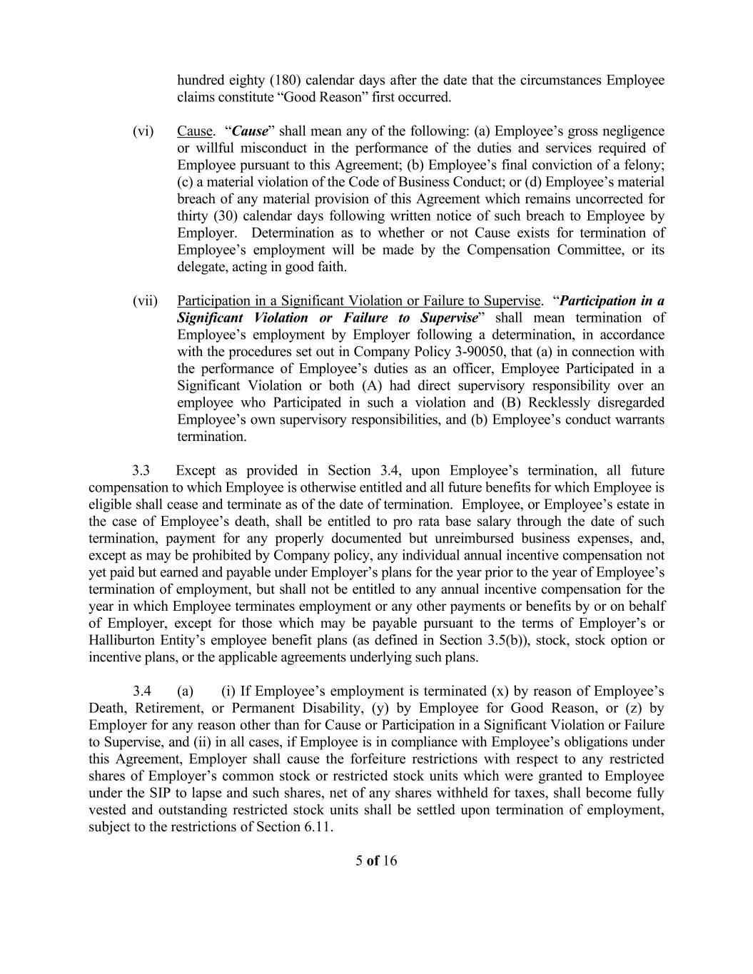 5 of 16 hundred eighty (180) calendar days after the date that the circumstances Employee claims constitute “Good Reason” first occurred. (vi) Cause. “Cause” shall mean any of the following: (a) Employee’s gross negligence or willful misconduct in the performance of the duties and services required of Employee pursuant to this Agreement; (b) Employee’s final conviction of a felony; (c) a material violation of the Code of Business Conduct; or (d) Employee’s material breach of any material provision of this Agreement which remains uncorrected for thirty (30) calendar days following written notice of such breach to Employee by Employer. Determination as to whether or not Cause exists for termination of Employee’s employment will be made by the Compensation Committee, or its delegate, acting in good faith. (vii) Participation in a Significant Violation or Failure to Supervise. “Participation in a Significant Violation or Failure to Supervise” shall mean termination of Employee’s employment by Employer following a determination, in accordance with the procedures set out in Company Policy 3-90050, that (a) in connection with the performance of Employee’s duties as an officer, Employee Participated in a Significant Violation or both (A) had direct supervisory responsibility over an employee who Participated in such a violation and (B) Recklessly disregarded Employee’s own supervisory responsibilities, and (b) Employee’s conduct warrants termination. 3.3 Except as provided in Section 3.4, upon Employee’s termination, all future compensation to which Employee is otherwise entitled and all future benefits for which Employee is eligible shall cease and terminate as of the date of termination. Employee, or Employee’s estate in the case of Employee’s death, shall be entitled to pro rata base salary through the date of such termination, payment for any properly documented but unreimbursed business expenses, and, except as may be prohibited by Company policy, any individual annual incentive compensation not yet paid but earned and payable under Employer’s plans for the year prior to the year of Employee’s termination of employment, but shall not be entitled to any annual incentive compensation for the year in which Employee terminates employment or any other payments or benefits by or on behalf of Employer, except for those which may be payable pursuant to the terms of Employer’s or Halliburton Entity’s employee benefit plans (as defined in Section 3.5(b)), stock, stock option or incentive plans, or the applicable agreements underlying such plans. 3.4 (a) (i) If Employee’s employment is terminated (x) by reason of Employee’s Death, Retirement, or Permanent Disability, (y) by Employee for Good Reason, or (z) by Employer for any reason other than for Cause or Participation in a Significant Violation or Failure to Supervise, and (ii) in all cases, if Employee is in compliance with Employee’s obligations under this Agreement, Employer shall cause the forfeiture restrictions with respect to any restricted shares of Employer’s common stock or restricted stock units which were granted to Employee under the SIP to lapse and such shares, net of any shares withheld for taxes, shall become fully vested and outstanding restricted stock units shall be settled upon termination of employment, subject to the restrictions of Section 6.11.