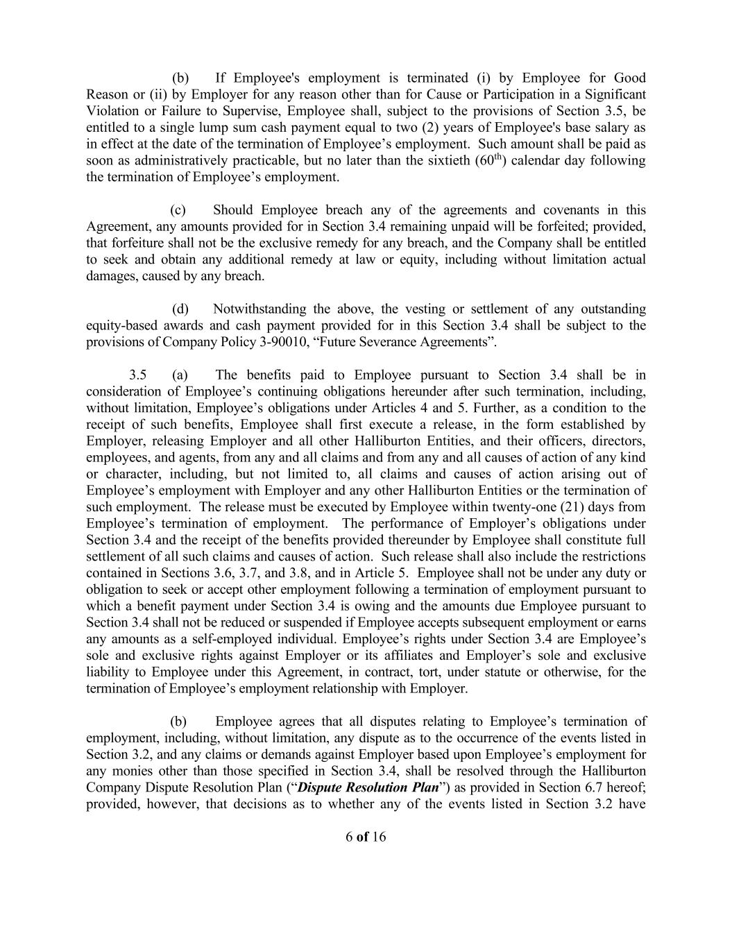 6 of 16 (b) If Employee's employment is terminated (i) by Employee for Good Reason or (ii) by Employer for any reason other than for Cause or Participation in a Significant Violation or Failure to Supervise, Employee shall, subject to the provisions of Section 3.5, be entitled to a single lump sum cash payment equal to two (2) years of Employee's base salary as in effect at the date of the termination of Employee’s employment. Such amount shall be paid as soon as administratively practicable, but no later than the sixtieth (60th) calendar day following the termination of Employee’s employment. (c) Should Employee breach any of the agreements and covenants in this Agreement, any amounts provided for in Section 3.4 remaining unpaid will be forfeited; provided, that forfeiture shall not be the exclusive remedy for any breach, and the Company shall be entitled to seek and obtain any additional remedy at law or equity, including without limitation actual damages, caused by any breach. (d) Notwithstanding the above, the vesting or settlement of any outstanding equity-based awards and cash payment provided for in this Section 3.4 shall be subject to the provisions of Company Policy 3-90010, “Future Severance Agreements”. 3.5 (a) The benefits paid to Employee pursuant to Section 3.4 shall be in consideration of Employee’s continuing obligations hereunder after such termination, including, without limitation, Employee’s obligations under Articles 4 and 5. Further, as a condition to the receipt of such benefits, Employee shall first execute a release, in the form established by Employer, releasing Employer and all other Halliburton Entities, and their officers, directors, employees, and agents, from any and all claims and from any and all causes of action of any kind or character, including, but not limited to, all claims and causes of action arising out of Employee’s employment with Employer and any other Halliburton Entities or the termination of such employment. The release must be executed by Employee within twenty-one (21) days from Employee’s termination of employment. The performance of Employer’s obligations under Section 3.4 and the receipt of the benefits provided thereunder by Employee shall constitute full settlement of all such claims and causes of action. Such release shall also include the restrictions contained in Sections 3.6, 3.7, and 3.8, and in Article 5. Employee shall not be under any duty or obligation to seek or accept other employment following a termination of employment pursuant to which a benefit payment under Section 3.4 is owing and the amounts due Employee pursuant to Section 3.4 shall not be reduced or suspended if Employee accepts subsequent employment or earns any amounts as a self-employed individual. Employee’s rights under Section 3.4 are Employee’s sole and exclusive rights against Employer or its affiliates and Employer’s sole and exclusive liability to Employee under this Agreement, in contract, tort, under statute or otherwise, for the termination of Employee’s employment relationship with Employer. (b) Employee agrees that all disputes relating to Employee’s termination of employment, including, without limitation, any dispute as to the occurrence of the events listed in Section 3.2, and any claims or demands against Employer based upon Employee’s employment for any monies other than those specified in Section 3.4, shall be resolved through the Halliburton Company Dispute Resolution Plan (“Dispute Resolution Plan”) as provided in Section 6.7 hereof; provided, however, that decisions as to whether any of the events listed in Section 3.2 have