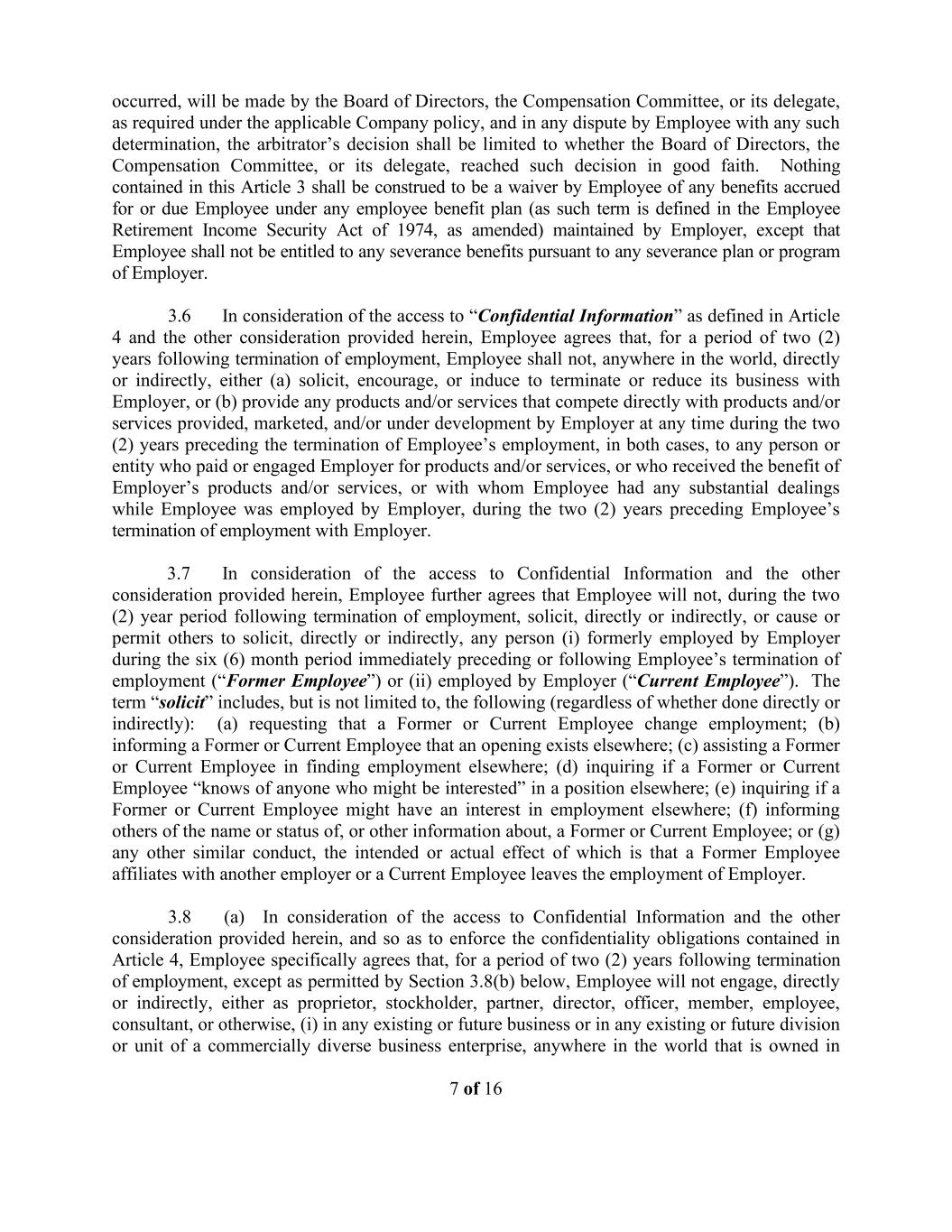 7 of 16 occurred, will be made by the Board of Directors, the Compensation Committee, or its delegate, as required under the applicable Company policy, and in any dispute by Employee with any such determination, the arbitrator’s decision shall be limited to whether the Board of Directors, the Compensation Committee, or its delegate, reached such decision in good faith. Nothing contained in this Article 3 shall be construed to be a waiver by Employee of any benefits accrued for or due Employee under any employee benefit plan (as such term is defined in the Employee Retirement Income Security Act of 1974, as amended) maintained by Employer, except that Employee shall not be entitled to any severance benefits pursuant to any severance plan or program of Employer. 3.6 In consideration of the access to “Confidential Information” as defined in Article 4 and the other consideration provided herein, Employee agrees that, for a period of two (2) years following termination of employment, Employee shall not, anywhere in the world, directly or indirectly, either (a) solicit, encourage, or induce to terminate or reduce its business with Employer, or (b) provide any products and/or services that compete directly with products and/or services provided, marketed, and/or under development by Employer at any time during the two (2) years preceding the termination of Employee’s employment, in both cases, to any person or entity who paid or engaged Employer for products and/or services, or who received the benefit of Employer’s products and/or services, or with whom Employee had any substantial dealings while Employee was employed by Employer, during the two (2) years preceding Employee’s termination of employment with Employer. 3.7 In consideration of the access to Confidential Information and the other consideration provided herein, Employee further agrees that Employee will not, during the two (2) year period following termination of employment, solicit, directly or indirectly, or cause or permit others to solicit, directly or indirectly, any person (i) formerly employed by Employer during the six (6) month period immediately preceding or following Employee’s termination of employment (“Former Employee”) or (ii) employed by Employer (“Current Employee”). The term “solicit” includes, but is not limited to, the following (regardless of whether done directly or indirectly): (a) requesting that a Former or Current Employee change employment; (b) informing a Former or Current Employee that an opening exists elsewhere; (c) assisting a Former or Current Employee in finding employment elsewhere; (d) inquiring if a Former or Current Employee “knows of anyone who might be interested” in a position elsewhere; (e) inquiring if a Former or Current Employee might have an interest in employment elsewhere; (f) informing others of the name or status of, or other information about, a Former or Current Employee; or (g) any other similar conduct, the intended or actual effect of which is that a Former Employee affiliates with another employer or a Current Employee leaves the employment of Employer. 3.8 (a) In consideration of the access to Confidential Information and the other consideration provided herein, and so as to enforce the confidentiality obligations contained in Article 4, Employee specifically agrees that, for a period of two (2) years following termination of employment, except as permitted by Section 3.8(b) below, Employee will not engage, directly or indirectly, either as proprietor, stockholder, partner, director, officer, member, employee, consultant, or otherwise, (i) in any existing or future business or in any existing or future division or unit of a commercially diverse business enterprise, anywhere in the world that is owned in