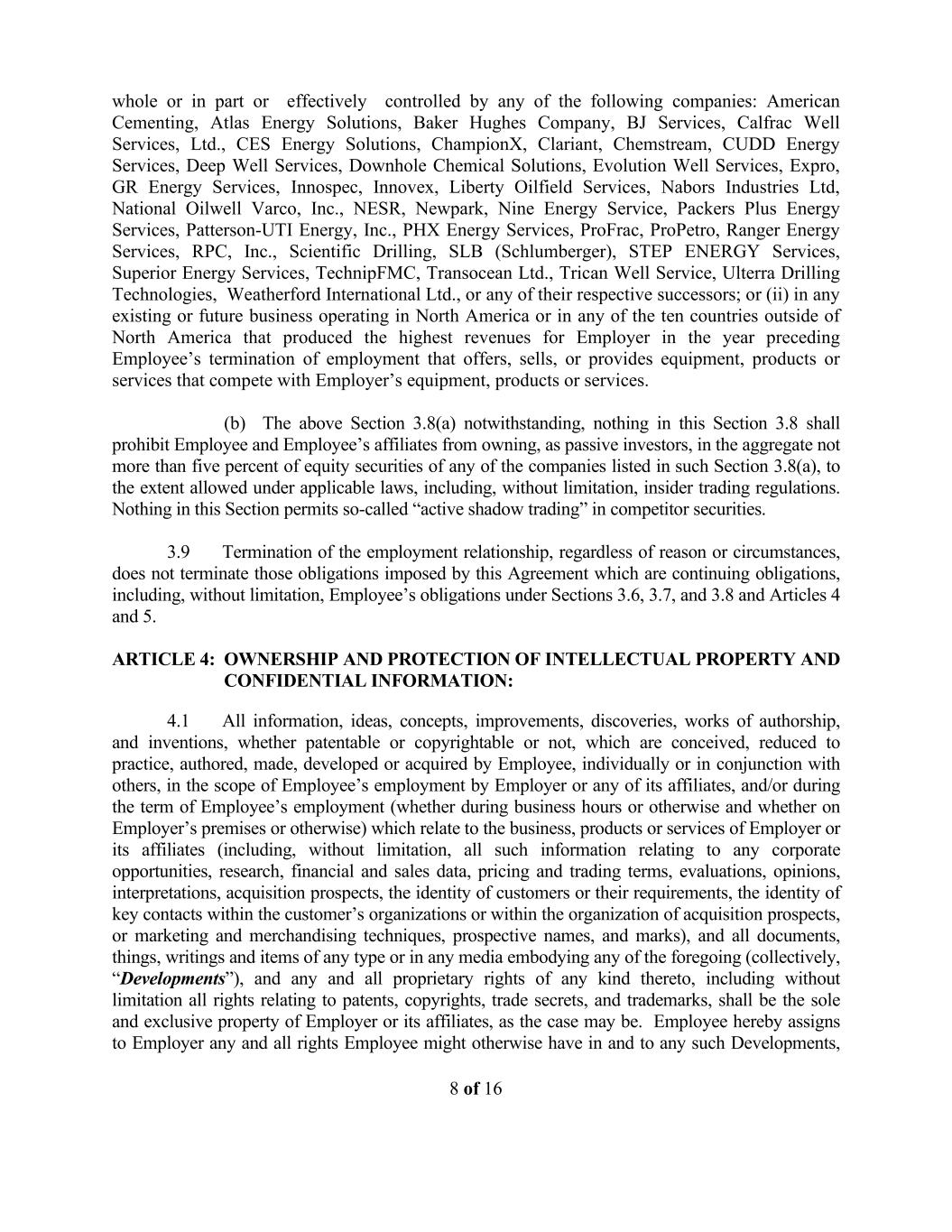 8 of 16 whole or in part or effectively controlled by any of the following companies: American Cementing, Atlas Energy Solutions, Baker Hughes Company, BJ Services, Calfrac Well Services, Ltd., CES Energy Solutions, ChampionX, Clariant, Chemstream, CUDD Energy Services, Deep Well Services, Downhole Chemical Solutions, Evolution Well Services, Expro, GR Energy Services, Innospec, Innovex, Liberty Oilfield Services, Nabors Industries Ltd, National Oilwell Varco, Inc., NESR, Newpark, Nine Energy Service, Packers Plus Energy Services, Patterson-UTI Energy, Inc., PHX Energy Services, ProFrac, ProPetro, Ranger Energy Services, RPC, Inc., Scientific Drilling, SLB (Schlumberger), STEP ENERGY Services, Superior Energy Services, TechnipFMC, Transocean Ltd., Trican Well Service, Ulterra Drilling Technologies, Weatherford International Ltd., or any of their respective successors; or (ii) in any existing or future business operating in North America or in any of the ten countries outside of North America that produced the highest revenues for Employer in the year preceding Employee’s termination of employment that offers, sells, or provides equipment, products or services that compete with Employer’s equipment, products or services. (b) The above Section 3.8(a) notwithstanding, nothing in this Section 3.8 shall prohibit Employee and Employee’s affiliates from owning, as passive investors, in the aggregate not more than five percent of equity securities of any of the companies listed in such Section 3.8(a), to the extent allowed under applicable laws, including, without limitation, insider trading regulations. Nothing in this Section permits so-called “active shadow trading” in competitor securities. 3.9 Termination of the employment relationship, regardless of reason or circumstances, does not terminate those obligations imposed by this Agreement which are continuing obligations, including, without limitation, Employee’s obligations under Sections 3.6, 3.7, and 3.8 and Articles 4 and 5. ARTICLE 4: OWNERSHIP AND PROTECTION OF INTELLECTUAL PROPERTY AND CONFIDENTIAL INFORMATION: 4.1 All information, ideas, concepts, improvements, discoveries, works of authorship, and inventions, whether patentable or copyrightable or not, which are conceived, reduced to practice, authored, made, developed or acquired by Employee, individually or in conjunction with others, in the scope of Employee’s employment by Employer or any of its affiliates, and/or during the term of Employee’s employment (whether during business hours or otherwise and whether on Employer’s premises or otherwise) which relate to the business, products or services of Employer or its affiliates (including, without limitation, all such information relating to any corporate opportunities, research, financial and sales data, pricing and trading terms, evaluations, opinions, interpretations, acquisition prospects, the identity of customers or their requirements, the identity of key contacts within the customer’s organizations or within the organization of acquisition prospects, or marketing and merchandising techniques, prospective names, and marks), and all documents, things, writings and items of any type or in any media embodying any of the foregoing (collectively, “Developments”), and any and all proprietary rights of any kind thereto, including without limitation all rights relating to patents, copyrights, trade secrets, and trademarks, shall be the sole and exclusive property of Employer or its affiliates, as the case may be. Employee hereby assigns to Employer any and all rights Employee might otherwise have in and to any such Developments,
