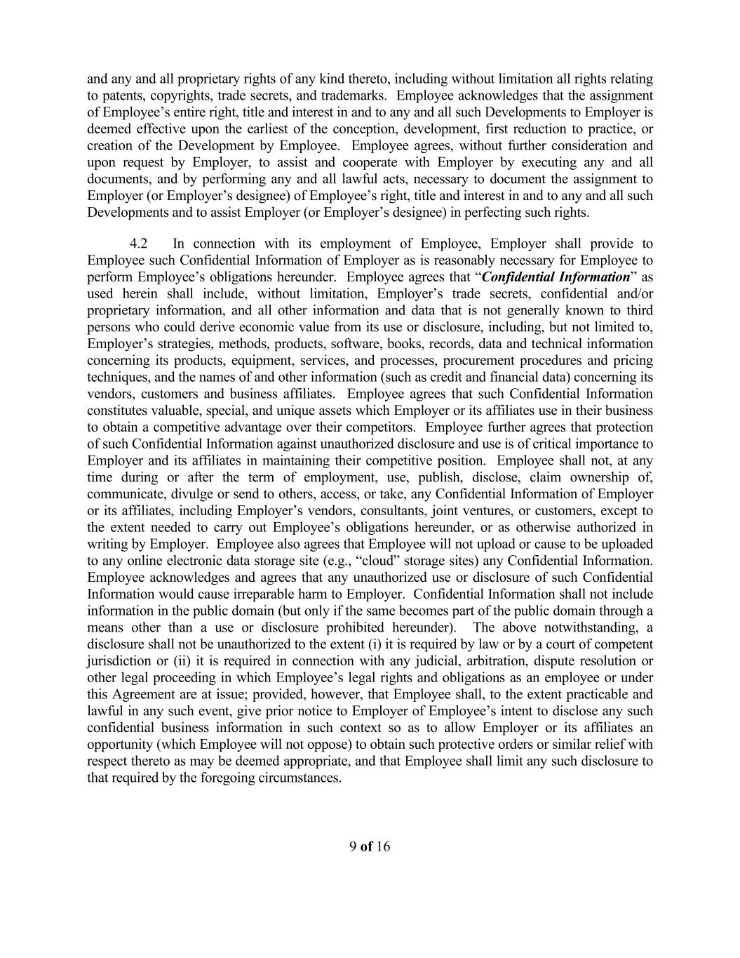 9 of 16 and any and all proprietary rights of any kind thereto, including without limitation all rights relating to patents, copyrights, trade secrets, and trademarks. Employee acknowledges that the assignment of Employee’s entire right, title and interest in and to any and all such Developments to Employer is deemed effective upon the earliest of the conception, development, first reduction to practice, or creation of the Development by Employee. Employee agrees, without further consideration and upon request by Employer, to assist and cooperate with Employer by executing any and all documents, and by performing any and all lawful acts, necessary to document the assignment to Employer (or Employer’s designee) of Employee’s right, title and interest in and to any and all such Developments and to assist Employer (or Employer’s designee) in perfecting such rights. 4.2 In connection with its employment of Employee, Employer shall provide to Employee such Confidential Information of Employer as is reasonably necessary for Employee to perform Employee’s obligations hereunder. Employee agrees that “Confidential Information” as used herein shall include, without limitation, Employer’s trade secrets, confidential and/or proprietary information, and all other information and data that is not generally known to third persons who could derive economic value from its use or disclosure, including, but not limited to, Employer’s strategies, methods, products, software, books, records, data and technical information concerning its products, equipment, services, and processes, procurement procedures and pricing techniques, and the names of and other information (such as credit and financial data) concerning its vendors, customers and business affiliates. Employee agrees that such Confidential Information constitutes valuable, special, and unique assets which Employer or its affiliates use in their business to obtain a competitive advantage over their competitors. Employee further agrees that protection of such Confidential Information against unauthorized disclosure and use is of critical importance to Employer and its affiliates in maintaining their competitive position. Employee shall not, at any time during or after the term of employment, use, publish, disclose, claim ownership of, communicate, divulge or send to others, access, or take, any Confidential Information of Employer or its affiliates, including Employer’s vendors, consultants, joint ventures, or customers, except to the extent needed to carry out Employee’s obligations hereunder, or as otherwise authorized in writing by Employer. Employee also agrees that Employee will not upload or cause to be uploaded to any online electronic data storage site (e.g., “cloud” storage sites) any Confidential Information. Employee acknowledges and agrees that any unauthorized use or disclosure of such Confidential Information would cause irreparable harm to Employer. Confidential Information shall not include information in the public domain (but only if the same becomes part of the public domain through a means other than a use or disclosure prohibited hereunder). The above notwithstanding, a disclosure shall not be unauthorized to the extent (i) it is required by law or by a court of competent jurisdiction or (ii) it is required in connection with any judicial, arbitration, dispute resolution or other legal proceeding in which Employee’s legal rights and obligations as an employee or under this Agreement are at issue; provided, however, that Employee shall, to the extent practicable and lawful in any such event, give prior notice to Employer of Employee’s intent to disclose any such confidential business information in such context so as to allow Employer or its affiliates an opportunity (which Employee will not oppose) to obtain such protective orders or similar relief with respect thereto as may be deemed appropriate, and that Employee shall limit any such disclosure to that required by the foregoing circumstances.
