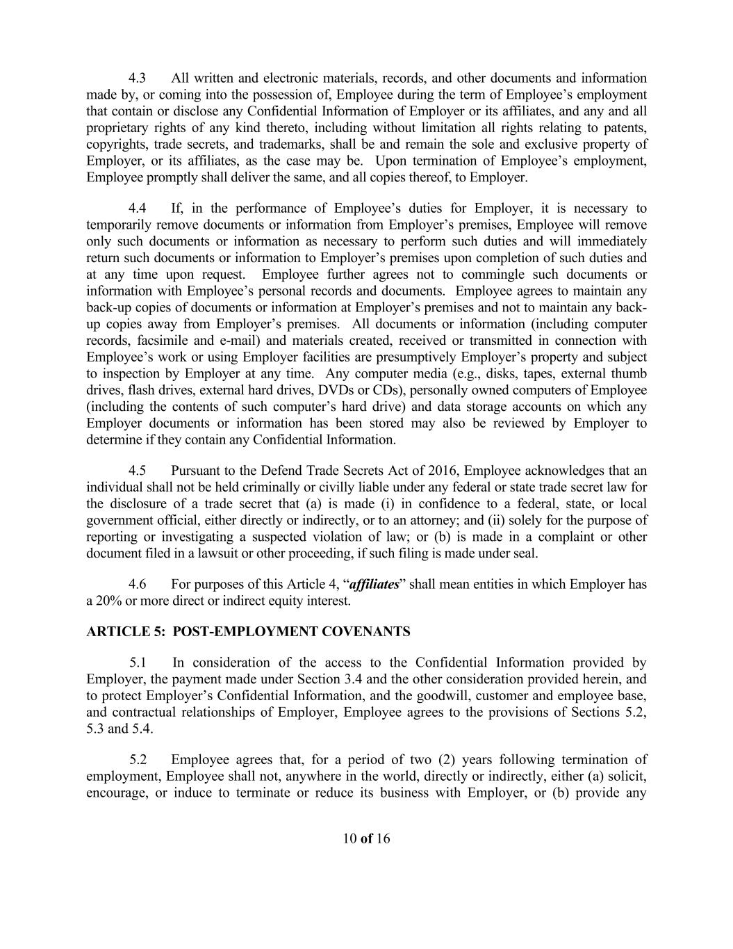 10 of 16 4.3 All written and electronic materials, records, and other documents and information made by, or coming into the possession of, Employee during the term of Employee’s employment that contain or disclose any Confidential Information of Employer or its affiliates, and any and all proprietary rights of any kind thereto, including without limitation all rights relating to patents, copyrights, trade secrets, and trademarks, shall be and remain the sole and exclusive property of Employer, or its affiliates, as the case may be. Upon termination of Employee’s employment, Employee promptly shall deliver the same, and all copies thereof, to Employer. 4.4 If, in the performance of Employee’s duties for Employer, it is necessary to temporarily remove documents or information from Employer’s premises, Employee will remove only such documents or information as necessary to perform such duties and will immediately return such documents or information to Employer’s premises upon completion of such duties and at any time upon request. Employee further agrees not to commingle such documents or information with Employee’s personal records and documents. Employee agrees to maintain any back-up copies of documents or information at Employer’s premises and not to maintain any back- up copies away from Employer’s premises. All documents or information (including computer records, facsimile and e-mail) and materials created, received or transmitted in connection with Employee’s work or using Employer facilities are presumptively Employer’s property and subject to inspection by Employer at any time. Any computer media (e.g., disks, tapes, external thumb drives, flash drives, external hard drives, DVDs or CDs), personally owned computers of Employee (including the contents of such computer’s hard drive) and data storage accounts on which any Employer documents or information has been stored may also be reviewed by Employer to determine if they contain any Confidential Information. 4.5 Pursuant to the Defend Trade Secrets Act of 2016, Employee acknowledges that an individual shall not be held criminally or civilly liable under any federal or state trade secret law for the disclosure of a trade secret that (a) is made (i) in confidence to a federal, state, or local government official, either directly or indirectly, or to an attorney; and (ii) solely for the purpose of reporting or investigating a suspected violation of law; or (b) is made in a complaint or other document filed in a lawsuit or other proceeding, if such filing is made under seal. 4.6 For purposes of this Article 4, “affiliates” shall mean entities in which Employer has a 20% or more direct or indirect equity interest. ARTICLE 5: POST-EMPLOYMENT COVENANTS 5.1 In consideration of the access to the Confidential Information provided by Employer, the payment made under Section 3.4 and the other consideration provided herein, and to protect Employer’s Confidential Information, and the goodwill, customer and employee base, and contractual relationships of Employer, Employee agrees to the provisions of Sections 5.2, 5.3 and 5.4. 5.2 Employee agrees that, for a period of two (2) years following termination of employment, Employee shall not, anywhere in the world, directly or indirectly, either (a) solicit, encourage, or induce to terminate or reduce its business with Employer, or (b) provide any