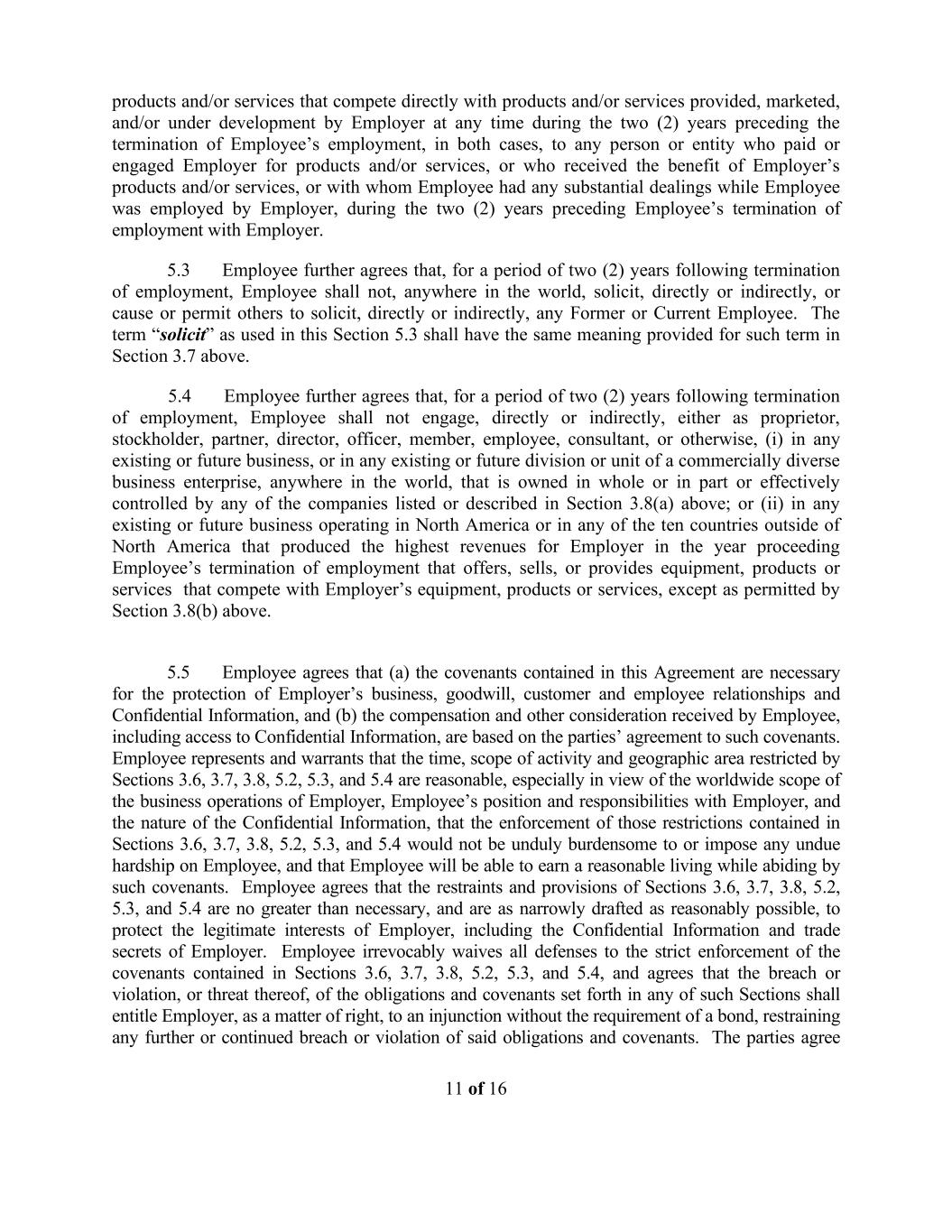 11 of 16 products and/or services that compete directly with products and/or services provided, marketed, and/or under development by Employer at any time during the two (2) years preceding the termination of Employee’s employment, in both cases, to any person or entity who paid or engaged Employer for products and/or services, or who received the benefit of Employer’s products and/or services, or with whom Employee had any substantial dealings while Employee was employed by Employer, during the two (2) years preceding Employee’s termination of employment with Employer. 5.3 Employee further agrees that, for a period of two (2) years following termination of employment, Employee shall not, anywhere in the world, solicit, directly or indirectly, or cause or permit others to solicit, directly or indirectly, any Former or Current Employee. The term “solicit” as used in this Section 5.3 shall have the same meaning provided for such term in Section 3.7 above. 5.4 Employee further agrees that, for a period of two (2) years following termination of employment, Employee shall not engage, directly or indirectly, either as proprietor, stockholder, partner, director, officer, member, employee, consultant, or otherwise, (i) in any existing or future business, or in any existing or future division or unit of a commercially diverse business enterprise, anywhere in the world, that is owned in whole or in part or effectively controlled by any of the companies listed or described in Section 3.8(a) above; or (ii) in any existing or future business operating in North America or in any of the ten countries outside of North America that produced the highest revenues for Employer in the year proceeding Employee’s termination of employment that offers, sells, or provides equipment, products or services that compete with Employer’s equipment, products or services, except as permitted by Section 3.8(b) above. 5.5 Employee agrees that (a) the covenants contained in this Agreement are necessary for the protection of Employer’s business, goodwill, customer and employee relationships and Confidential Information, and (b) the compensation and other consideration received by Employee, including access to Confidential Information, are based on the parties’ agreement to such covenants. Employee represents and warrants that the time, scope of activity and geographic area restricted by Sections 3.6, 3.7, 3.8, 5.2, 5.3, and 5.4 are reasonable, especially in view of the worldwide scope of the business operations of Employer, Employee’s position and responsibilities with Employer, and the nature of the Confidential Information, that the enforcement of those restrictions contained in Sections 3.6, 3.7, 3.8, 5.2, 5.3, and 5.4 would not be unduly burdensome to or impose any undue hardship on Employee, and that Employee will be able to earn a reasonable living while abiding by such covenants. Employee agrees that the restraints and provisions of Sections 3.6, 3.7, 3.8, 5.2, 5.3, and 5.4 are no greater than necessary, and are as narrowly drafted as reasonably possible, to protect the legitimate interests of Employer, including the Confidential Information and trade secrets of Employer. Employee irrevocably waives all defenses to the strict enforcement of the covenants contained in Sections 3.6, 3.7, 3.8, 5.2, 5.3, and 5.4, and agrees that the breach or violation, or threat thereof, of the obligations and covenants set forth in any of such Sections shall entitle Employer, as a matter of right, to an injunction without the requirement of a bond, restraining any further or continued breach or violation of said obligations and covenants. The parties agree