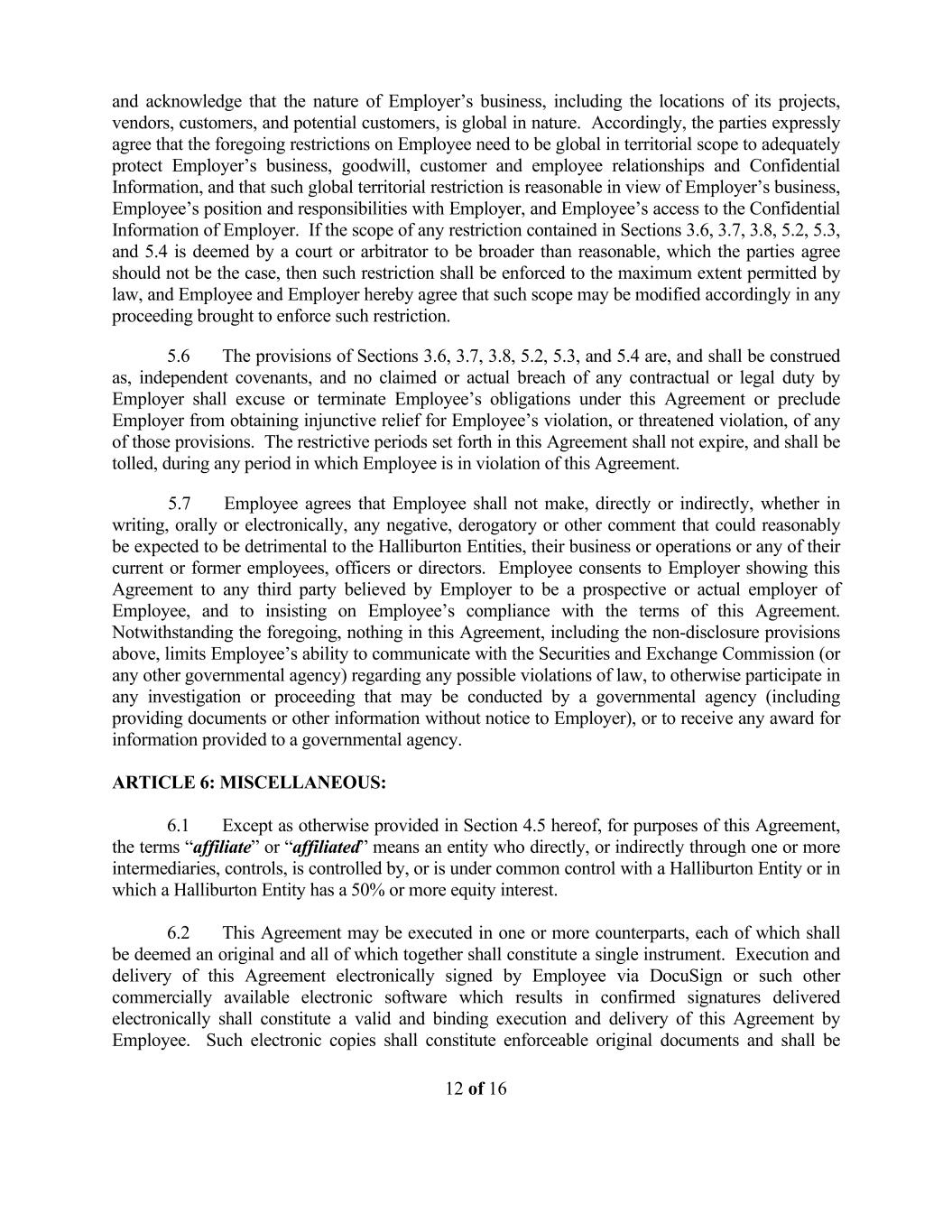 12 of 16 and acknowledge that the nature of Employer’s business, including the locations of its projects, vendors, customers, and potential customers, is global in nature. Accordingly, the parties expressly agree that the foregoing restrictions on Employee need to be global in territorial scope to adequately protect Employer’s business, goodwill, customer and employee relationships and Confidential Information, and that such global territorial restriction is reasonable in view of Employer’s business, Employee’s position and responsibilities with Employer, and Employee’s access to the Confidential Information of Employer. If the scope of any restriction contained in Sections 3.6, 3.7, 3.8, 5.2, 5.3, and 5.4 is deemed by a court or arbitrator to be broader than reasonable, which the parties agree should not be the case, then such restriction shall be enforced to the maximum extent permitted by law, and Employee and Employer hereby agree that such scope may be modified accordingly in any proceeding brought to enforce such restriction. 5.6 The provisions of Sections 3.6, 3.7, 3.8, 5.2, 5.3, and 5.4 are, and shall be construed as, independent covenants, and no claimed or actual breach of any contractual or legal duty by Employer shall excuse or terminate Employee’s obligations under this Agreement or preclude Employer from obtaining injunctive relief for Employee’s violation, or threatened violation, of any of those provisions. The restrictive periods set forth in this Agreement shall not expire, and shall be tolled, during any period in which Employee is in violation of this Agreement. 5.7 Employee agrees that Employee shall not make, directly or indirectly, whether in writing, orally or electronically, any negative, derogatory or other comment that could reasonably be expected to be detrimental to the Halliburton Entities, their business or operations or any of their current or former employees, officers or directors. Employee consents to Employer showing this Agreement to any third party believed by Employer to be a prospective or actual employer of Employee, and to insisting on Employee’s compliance with the terms of this Agreement. Notwithstanding the foregoing, nothing in this Agreement, including the non-disclosure provisions above, limits Employee’s ability to communicate with the Securities and Exchange Commission (or any other governmental agency) regarding any possible violations of law, to otherwise participate in any investigation or proceeding that may be conducted by a governmental agency (including providing documents or other information without notice to Employer), or to receive any award for information provided to a governmental agency. ARTICLE 6: MISCELLANEOUS: 6.1 Except as otherwise provided in Section 4.5 hereof, for purposes of this Agreement, the terms “affiliate” or “affiliated” means an entity who directly, or indirectly through one or more intermediaries, controls, is controlled by, or is under common control with a Halliburton Entity or in which a Halliburton Entity has a 50% or more equity interest. 6.2 This Agreement may be executed in one or more counterparts, each of which shall be deemed an original and all of which together shall constitute a single instrument. Execution and delivery of this Agreement electronically signed by Employee via DocuSign or such other commercially available electronic software which results in confirmed signatures delivered electronically shall constitute a valid and binding execution and delivery of this Agreement by Employee. Such electronic copies shall constitute enforceable original documents and shall be