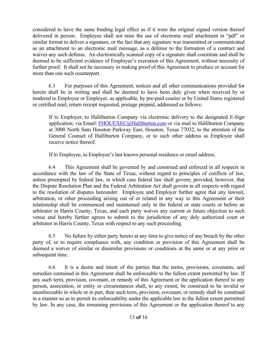 13 of 16 considered to have the same binding legal effect as if it were the original signed version thereof delivered in person. Employee shall not raise the use of electronic mail attachment in “pdf” or similar format to deliver a signature, or the fact that any signature was transmitted or communicated as an attachment to an electronic mail message, as a defense to the formation of a contract and waives any such defense. An electronically scanned copy of a signature shall constitute and shall be deemed to be sufficient evidence of Employee’s execution of this Agreement, without necessity of further proof. It shall not be necessary in making proof of this Agreement to produce or account for more than one such counterpart. 6.3 For purposes of this Agreement, notices and all other communications provided for herein shall be in writing and shall be deemed to have been duly given when received by or tendered to Employee or Employer, as applicable, by pre-paid courier or by United States registered or certified mail, return receipt requested, postage prepaid, addressed as follows: If to Employer, to Halliburton Company via electronic delivery to the designated E-Sign application; via Email: FHOUEXEC@Halliburton.com or via mail to Halliburton Company at 3000 North Sam Houston Parkway East, Houston, Texas 77032, to the attention of the General Counsel of Halliburton Company, or to such other address as Employee shall receive notice thereof. If to Employee, to Employee’s last known personal residence or email address. 6.4 This Agreement shall be governed by and construed and enforced in all respects in accordance with the law of the State of Texas, without regard to principles of conflicts of law, unless preempted by federal law, in which case federal law shall govern; provided, however, that the Dispute Resolution Plan and the Federal Arbitration Act shall govern in all respects with regard to the resolution of disputes hereunder. Employee and Employer further agree that any lawsuit, arbitration, or other proceeding arising out of or related in any way to this Agreement or their relationship shall be commenced and maintained only in the federal or state courts or before an arbitrator in Harris County, Texas, and each party waives any current or future objection to such venue and hereby further agrees to submit to the jurisdiction of any duly authorized court or arbitrator in Harris County, Texas with respect to any such proceeding. 6.5 No failure by either party hereto at any time to give notice of any breach by the other party of, or to require compliance with, any condition or provision of this Agreement shall be deemed a waiver of similar or dissimilar provisions or conditions at the same or at any prior or subsequent time. 6.6 It is a desire and intent of the parties that the terms, provisions, covenants, and remedies contained in this Agreement shall be enforceable to the fullest extent permitted by law. If any such term, provision, covenant, or remedy of this Agreement or the application thereof to any person, association, or entity or circumstances shall, to any extent, be construed to be invalid or unenforceable in whole or in part, then such term, provision, covenant, or remedy shall be construed in a manner so as to permit its enforceability under the applicable law to the fullest extent permitted by law. In any case, the remaining provisions of this Agreement or the application thereof to any