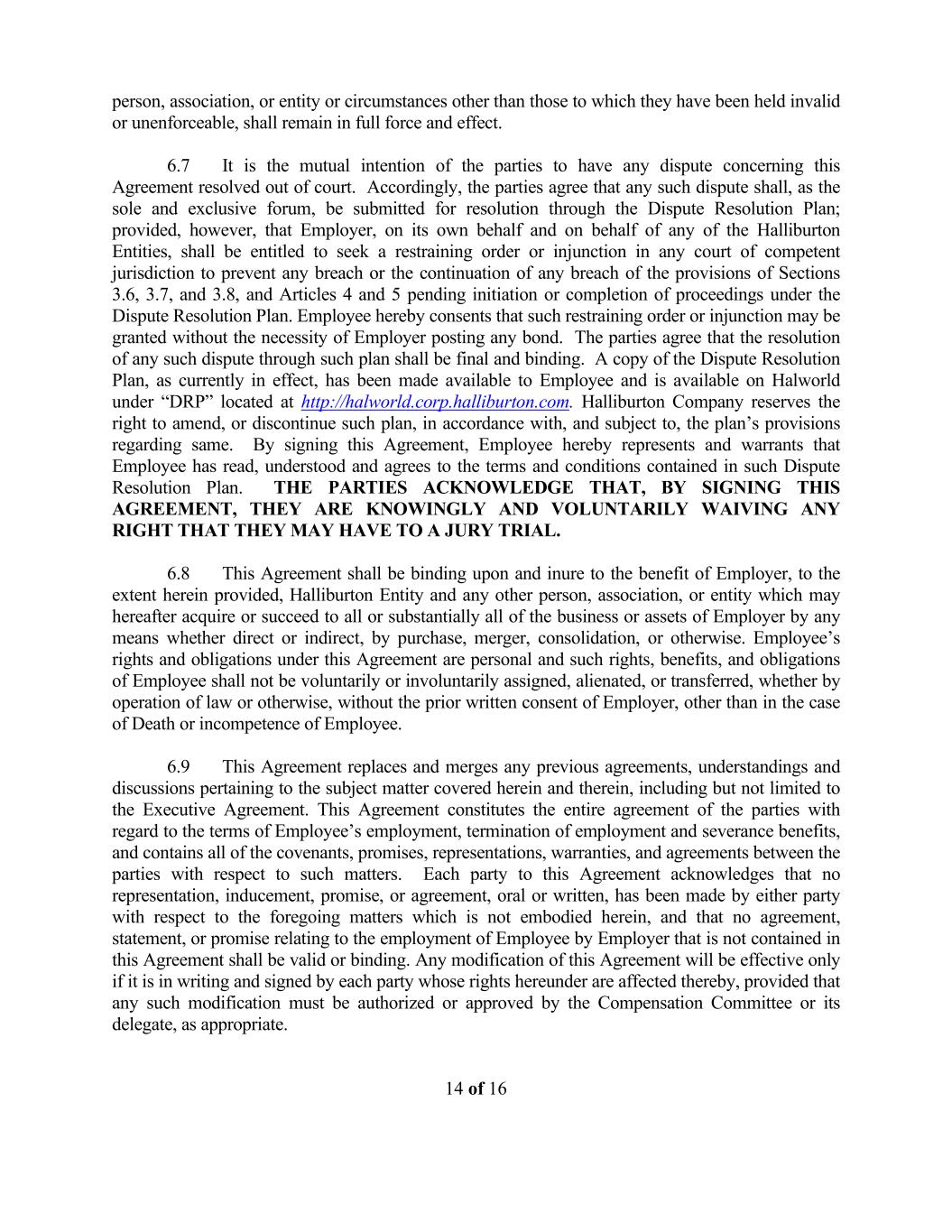 14 of 16 person, association, or entity or circumstances other than those to which they have been held invalid or unenforceable, shall remain in full force and effect. 6.7 It is the mutual intention of the parties to have any dispute concerning this Agreement resolved out of court. Accordingly, the parties agree that any such dispute shall, as the sole and exclusive forum, be submitted for resolution through the Dispute Resolution Plan; provided, however, that Employer, on its own behalf and on behalf of any of the Halliburton Entities, shall be entitled to seek a restraining order or injunction in any court of competent jurisdiction to prevent any breach or the continuation of any breach of the provisions of Sections 3.6, 3.7, and 3.8, and Articles 4 and 5 pending initiation or completion of proceedings under the Dispute Resolution Plan. Employee hereby consents that such restraining order or injunction may be granted without the necessity of Employer posting any bond. The parties agree that the resolution of any such dispute through such plan shall be final and binding. A copy of the Dispute Resolution Plan, as currently in effect, has been made available to Employee and is available on Halworld under “DRP” located at http://halworld.corp.halliburton.com. Halliburton Company reserves the right to amend, or discontinue such plan, in accordance with, and subject to, the plan’s provisions regarding same. By signing this Agreement, Employee hereby represents and warrants that Employee has read, understood and agrees to the terms and conditions contained in such Dispute Resolution Plan. THE PARTIES ACKNOWLEDGE THAT, BY SIGNING THIS AGREEMENT, THEY ARE KNOWINGLY AND VOLUNTARILY WAIVING ANY RIGHT THAT THEY MAY HAVE TO A JURY TRIAL. 6.8 This Agreement shall be binding upon and inure to the benefit of Employer, to the extent herein provided, Halliburton Entity and any other person, association, or entity which may hereafter acquire or succeed to all or substantially all of the business or assets of Employer by any means whether direct or indirect, by purchase, merger, consolidation, or otherwise. Employee’s rights and obligations under this Agreement are personal and such rights, benefits, and obligations of Employee shall not be voluntarily or involuntarily assigned, alienated, or transferred, whether by operation of law or otherwise, without the prior written consent of Employer, other than in the case of Death or incompetence of Employee. 6.9 This Agreement replaces and merges any previous agreements, understandings and discussions pertaining to the subject matter covered herein and therein, including but not limited to the Executive Agreement. This Agreement constitutes the entire agreement of the parties with regard to the terms of Employee’s employment, termination of employment and severance benefits, and contains all of the covenants, promises, representations, warranties, and agreements between the parties with respect to such matters. Each party to this Agreement acknowledges that no representation, inducement, promise, or agreement, oral or written, has been made by either party with respect to the foregoing matters which is not embodied herein, and that no agreement, statement, or promise relating to the employment of Employee by Employer that is not contained in this Agreement shall be valid or binding. Any modification of this Agreement will be effective only if it is in writing and signed by each party whose rights hereunder are affected thereby, provided that any such modification must be authorized or approved by the Compensation Committee or its delegate, as appropriate.