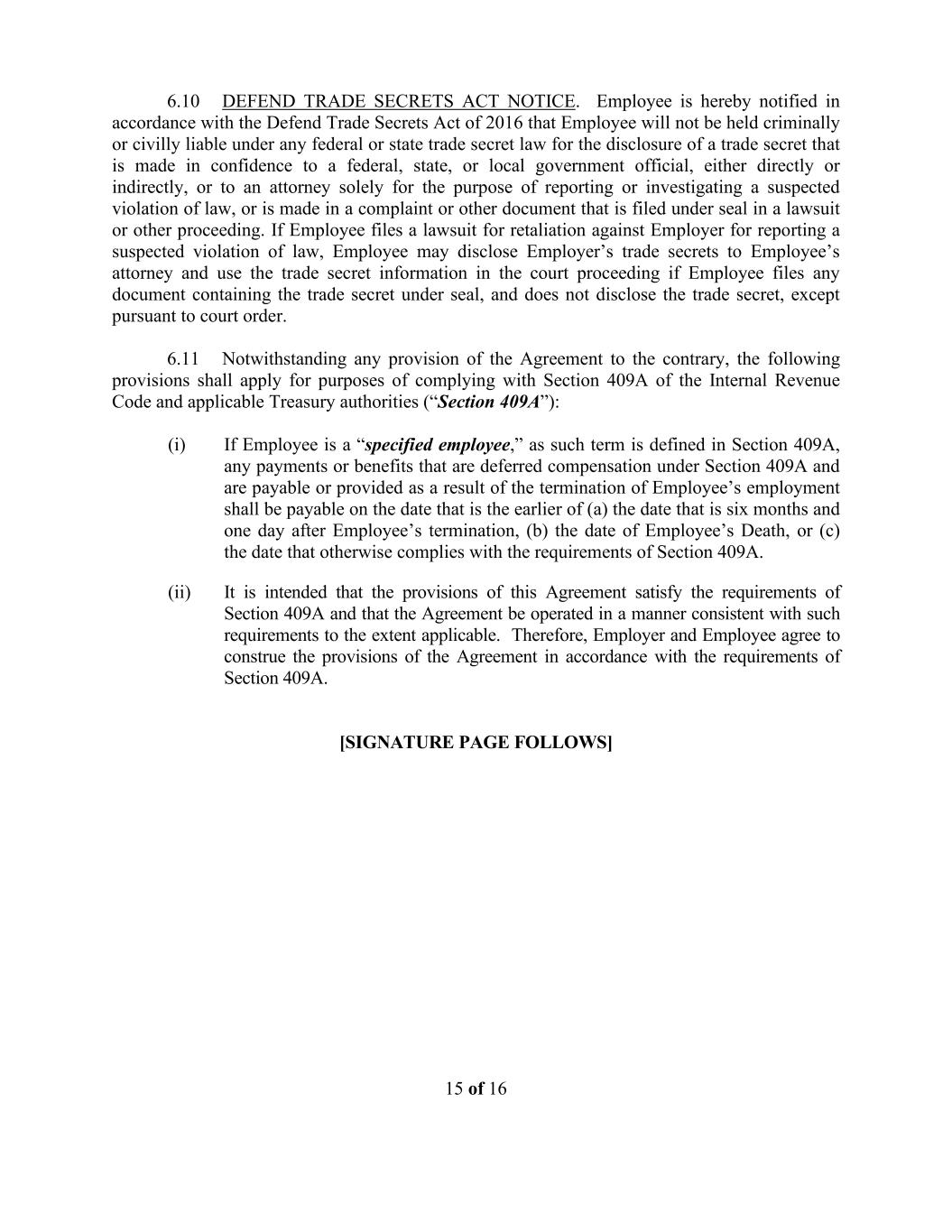 15 of 16 6.10 DEFEND TRADE SECRETS ACT NOTICE. Employee is hereby notified in accordance with the Defend Trade Secrets Act of 2016 that Employee will not be held criminally or civilly liable under any federal or state trade secret law for the disclosure of a trade secret that is made in confidence to a federal, state, or local government official, either directly or indirectly, or to an attorney solely for the purpose of reporting or investigating a suspected violation of law, or is made in a complaint or other document that is filed under seal in a lawsuit or other proceeding. If Employee files a lawsuit for retaliation against Employer for reporting a suspected violation of law, Employee may disclose Employer’s trade secrets to Employee’s attorney and use the trade secret information in the court proceeding if Employee files any document containing the trade secret under seal, and does not disclose the trade secret, except pursuant to court order. 6.11 Notwithstanding any provision of the Agreement to the contrary, the following provisions shall apply for purposes of complying with Section 409A of the Internal Revenue Code and applicable Treasury authorities (“Section 409A”): (i) If Employee is a “specified employee,” as such term is defined in Section 409A, any payments or benefits that are deferred compensation under Section 409A and are payable or provided as a result of the termination of Employee’s employment shall be payable on the date that is the earlier of (a) the date that is six months and one day after Employee’s termination, (b) the date of Employee’s Death, or (c) the date that otherwise complies with the requirements of Section 409A. (ii) It is intended that the provisions of this Agreement satisfy the requirements of Section 409A and that the Agreement be operated in a manner consistent with such requirements to the extent applicable. Therefore, Employer and Employee agree to construe the provisions of the Agreement in accordance with the requirements of Section 409A. [SIGNATURE PAGE FOLLOWS]