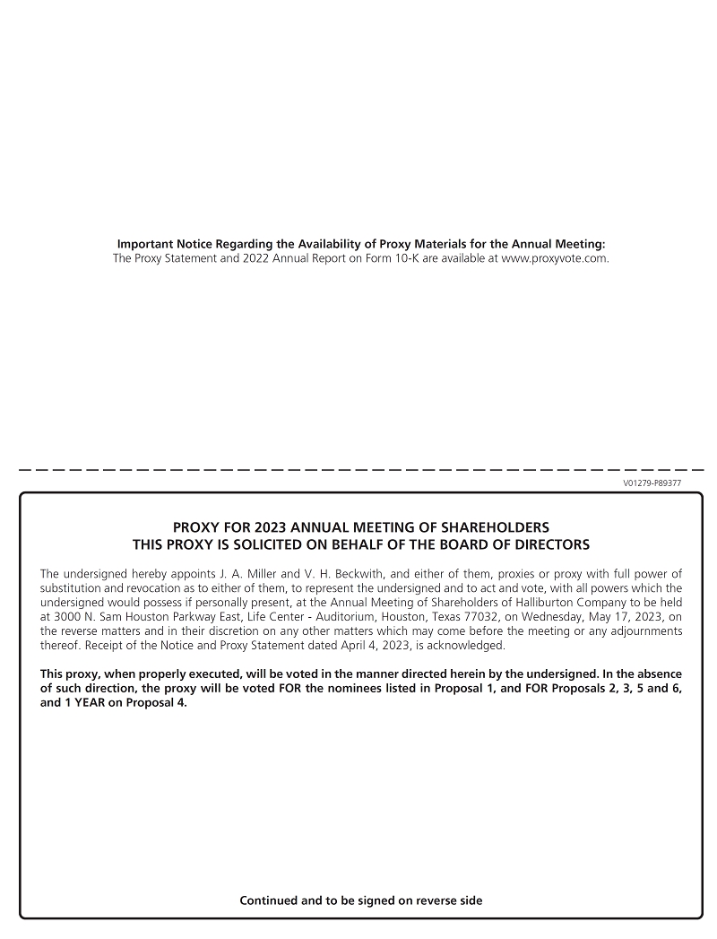 Halliburton Company, a Delaware corporation, will hold its Annual Meeting of Shareholders on Wednesday, May 17, 2023, at 9:00 a.m. Central Daylight Time at its corporate office at 3000 N. Sam Houston Parkway East, Life Center -Auditorium, Houston, Texas 77032.