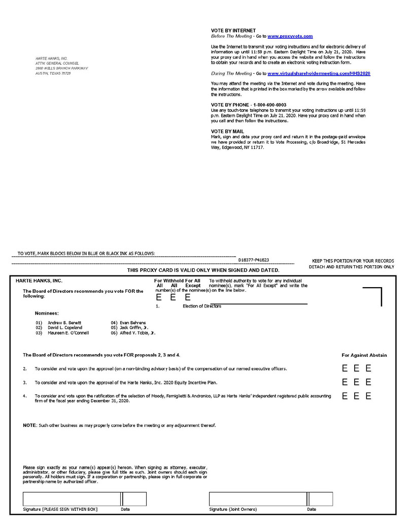 The enclosed proxy statement and our Annual Report on Form 10-K (the “Annual Report”) for the fiscal year ended December 31, 2019 (which we are distributing in lieu of a separate annual report to stockholders) are available on our website at www.hartehanks.com, under the heading “Financials & Filings” in the “Investors” section of our website. The proxy statement for the 2019 annual meeting of stockholders is also available on the same section of our website. Additionally, and in accordance with Securities and Exchange Commission (“SEC”) rules, you may access our proxy statements and Form 10-Ks at www.hartehanks.com.