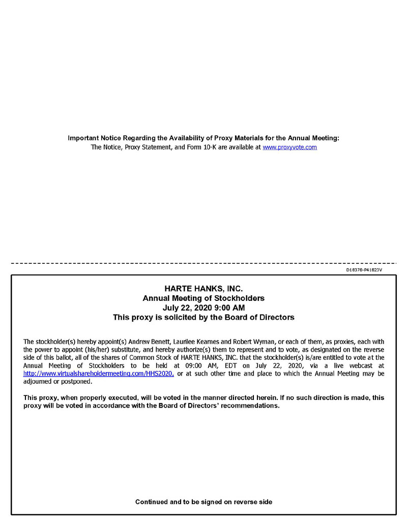 As a stockholder of Harte Hanks, Inc., a Delaware corporation (the "Company"), you are hereby given notice of, and invited to virtually attend the Company's 2020 annual meeting of stockholders (the "Annual Meeting"), which will be held virtually, exclusively via a live audio webcast on Wednesday, July 22, 2020, at 9:00 a.m. Eastern Daylight Time, for the following purposes: