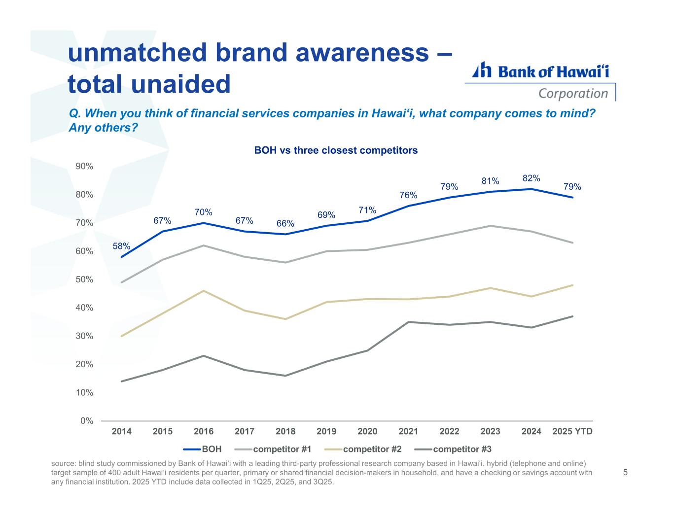 unmatched brand awareness – total unaided 58% 67% 70% 67% 66% 69% 71% 76% 79% 81% 82% 79% 0% 10% 20% 30% 40% 50% 60% 70% 80% 90% 2014 2015 2016 2017 2018 2019 2020 2021 2022 2023 2024 2025 YTD BOH vs three closest competitors BOH competitor #1 competitor #2 competitor #3 Q. When you think of financial services companies in Hawai‘i, what company comes to mind? Any others? source: blind study commissioned by Bank of Hawai‘i with a leading third-party professional research company based in Hawai‘i. hybrid (telephone and online) target sample of 400 adult Hawai‘i residents per quarter, primary or shared financial decision-makers in household, and have a checking or savings account with any financial institution. 2025 YTD include data collected in 1Q25, 2Q25, and 3Q25. 5