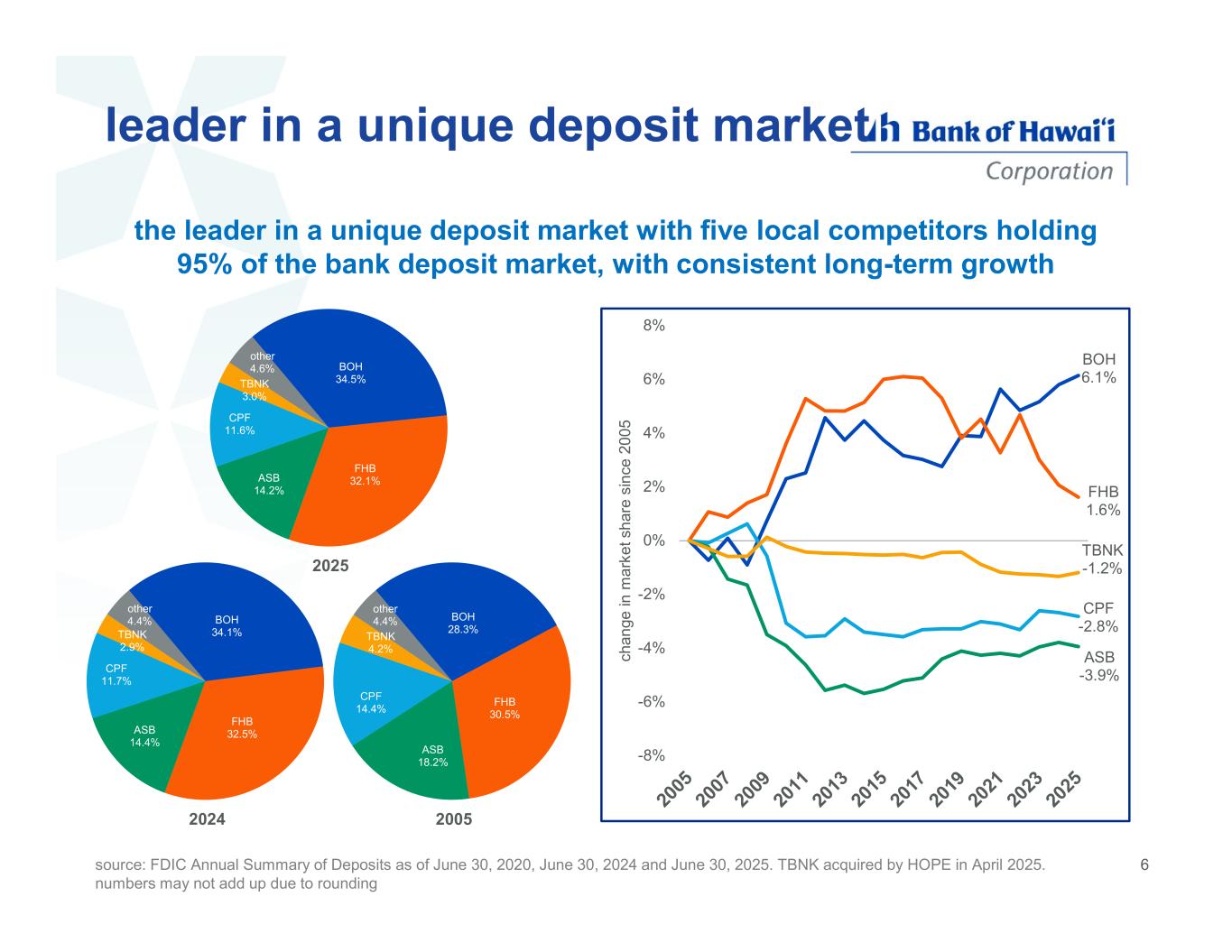 leader in a unique deposit market source: FDIC Annual Summary of Deposits as of June 30, 2020, June 30, 2024 and June 30, 2025. TBNK acquired by HOPE in April 2025. numbers may not add up due to rounding the leader in a unique deposit market with five local competitors holding 95% of the bank deposit market, with consistent long-term growth BOH 28.3% FHB 30.5% ASB 18.2% CPF 14.4% TBNK 4.2% other 4.4% 2005 BOH 34.1% FHB 32.5%ASB 14.4% CPF 11.7% TBNK 2.9% other 4.4% 2024 BOH 34.5% FHB 32.1%ASB 14.2% CPF 11.6% TBNK 3.0% other 4.6% 2025 BOH 6.1% FHB 1.6% CPF -2.8% ASB -3.9% TBNK -1.2% -8% -6% -4% -2% 0% 2% 4% 6% 8% ch an ge in m a rk e t s h ar e si n ce 2 0 05 6