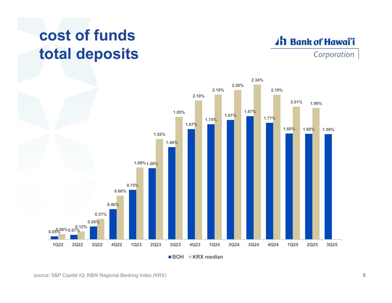 cost of funds interest-bearing deposits 0.07% 0.11% 0.30% 0.69% 1.09% 1.54% 1.95% 2.30% 2.39% 2.46% 2.52% 2.37% 2.16% 2.16% 2.14% 0.13% 0.20% 0.48% 0.97% 1.59% 2.11% 2.44% 2.73% 2.91% 2.99% 3.05% 2.84% 2.66% 2.63% 1Q22 2Q22 3Q22 4Q22 1Q23 2Q23 3Q23 4Q23 1Q24 2Q24 3Q24 4Q24 1Q25 2Q25 3Q25 BOH KRX median source: S&P Capital IQ; KBW Regional Banking Index (KRX) 7