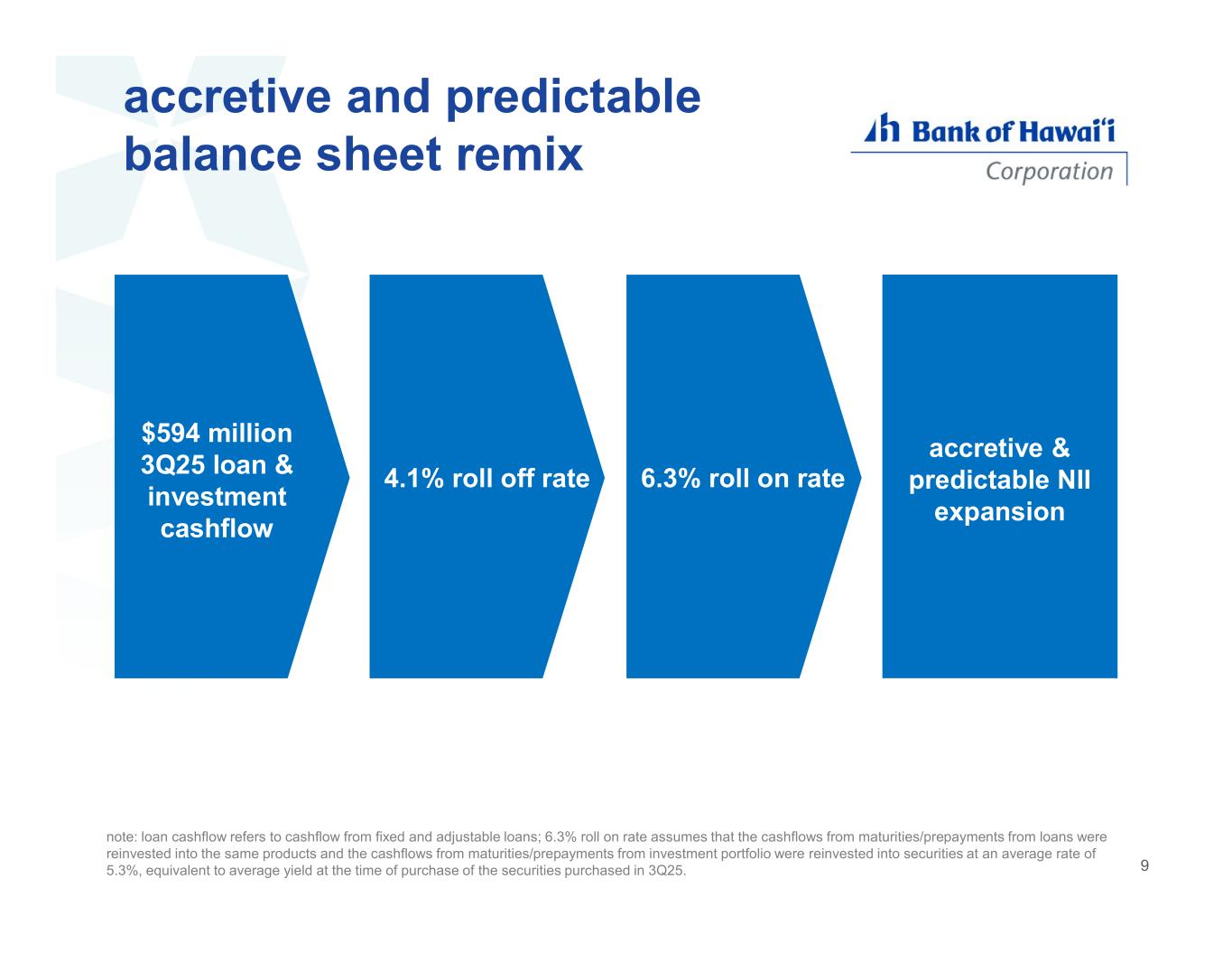 accretive and predictable balance sheet remix note: loan cashflow refers to cashflow from fixed and adjustable loans; 6.3% roll on rate assumes that the cashflows from maturities/prepayments from loans were reinvested into the same products and the cashflows from maturities/prepayments from investment portfolio were reinvested into securities at an average rate of 5.3%, equivalent to average yield at the time of purchase of the securities purchased in 3Q25. $594 million 3Q25 loan & investment cashflow 6.3% roll on rate accretive & predictable NII expansion 4.1% roll off rate 9