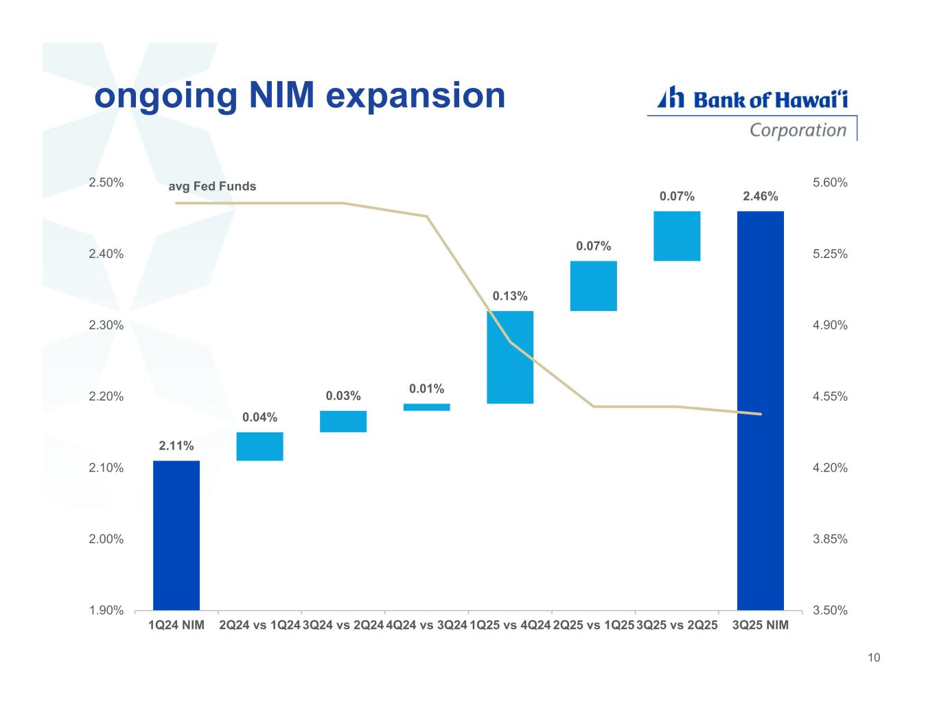 ongoing NIM expansion 2.11% 0.04% 0.03% 0.01% 0.13% 0.07% 0.07% 2.46% avg Fed Funds 3.50% 3.85% 4.20% 4.55% 4.90% 5.25% 5.60% 1.90% 2.00% 2.10% 2.20% 2.30% 2.40% 2.50% 1Q24 NIM 2Q24 vs 1Q24 3Q24 vs 2Q24 4Q24 vs 3Q24 1Q25 vs 4Q24 2Q25 vs 1Q25 3Q25 vs 2Q25 3Q25 NIM 10