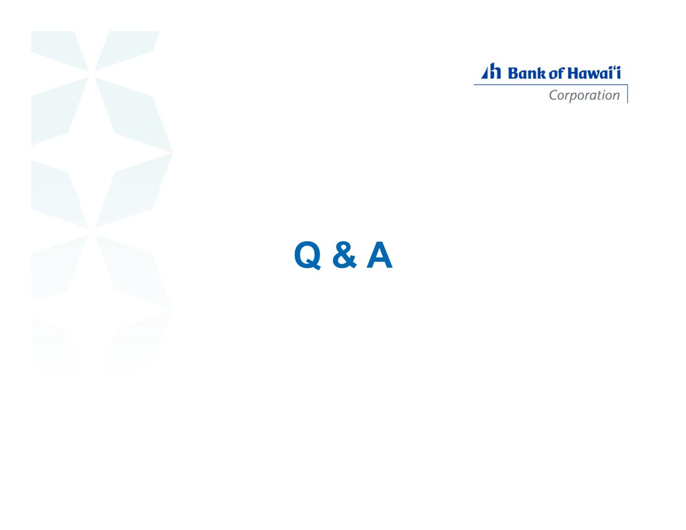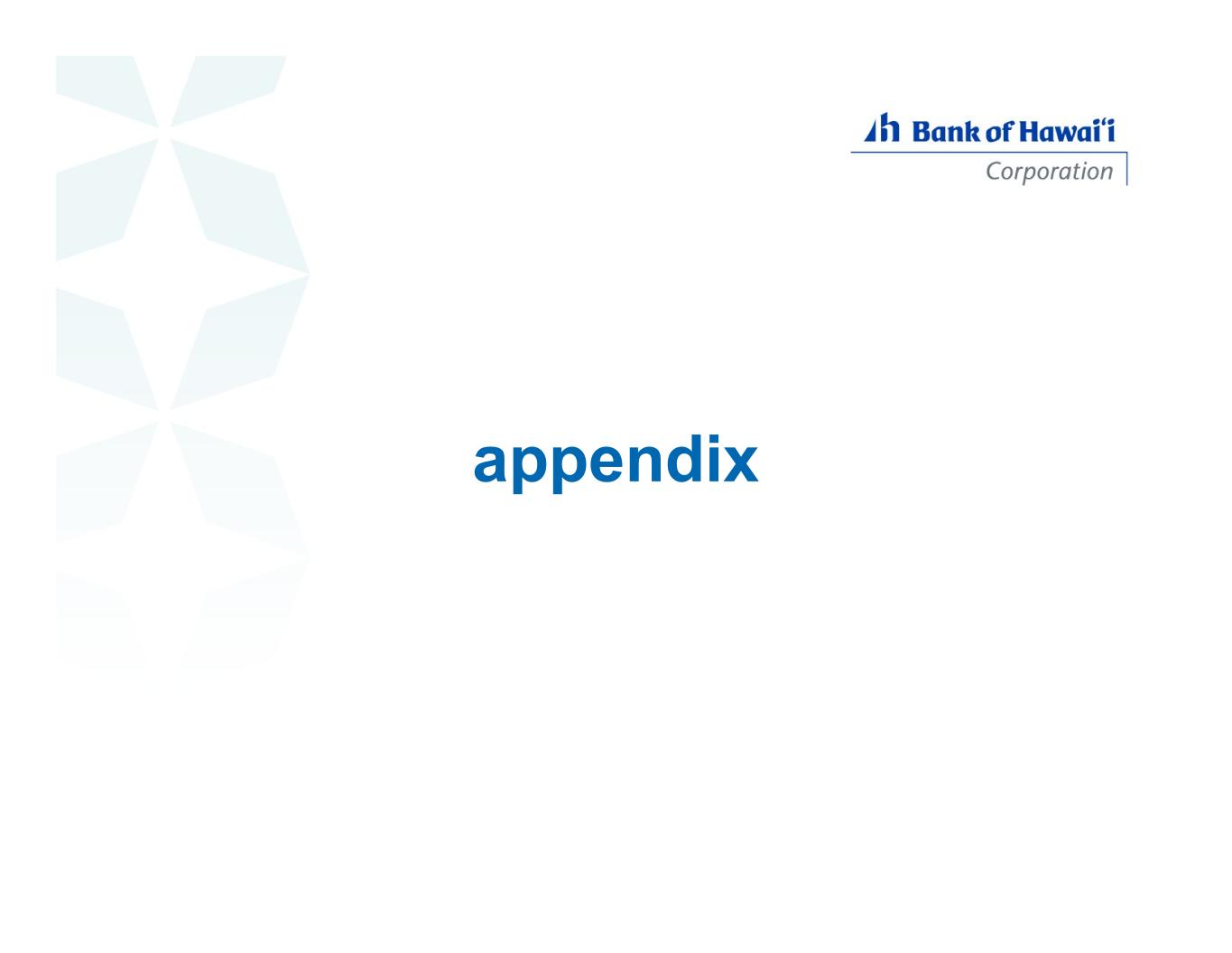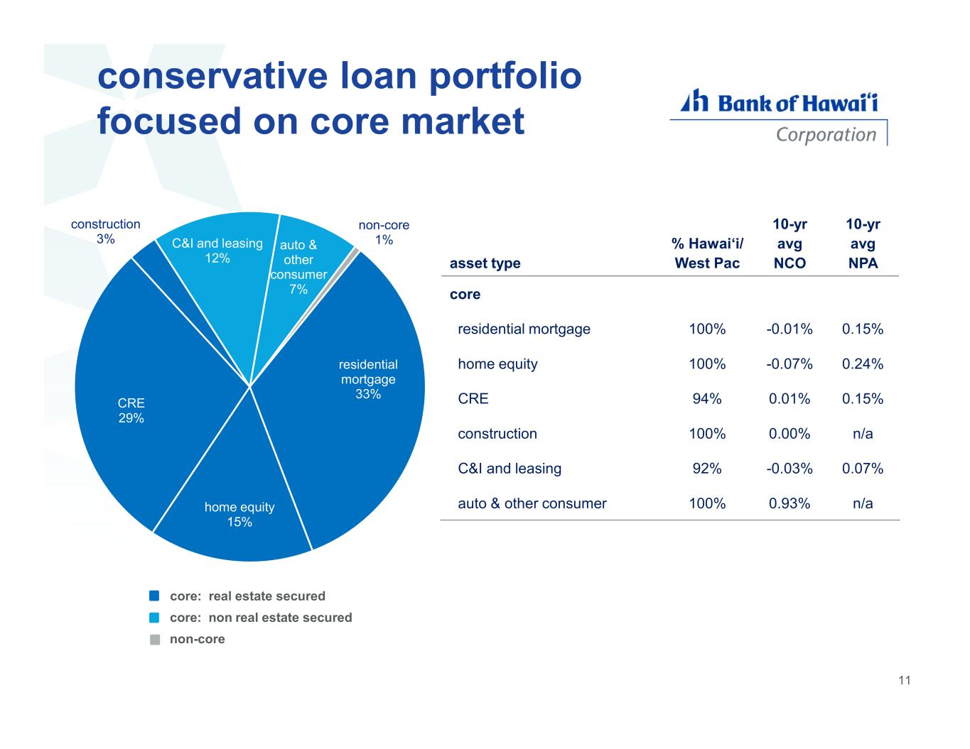 conservative loan portfolio focused on core market CRE C&I residential mortgage home equity auto residential mortgage 33% home equity 15% CRE 29% construction 3% C&I and leasing 12% auto & other consumer 7% non-core 1% 10-yr avg NPA 10-yr avg NCO % Hawaiʻi/ West Pac asset type core 0.15%-0.01%100%residential mortgage 0.24%-0.07%100%home equity 0.15%0.01%94%CRE n/a0.00%100%construction 0.07%-0.03%92%C&I and leasing n/a0.93%100%auto & other consumer core: real estate secured core: non real estate secured non-core 11