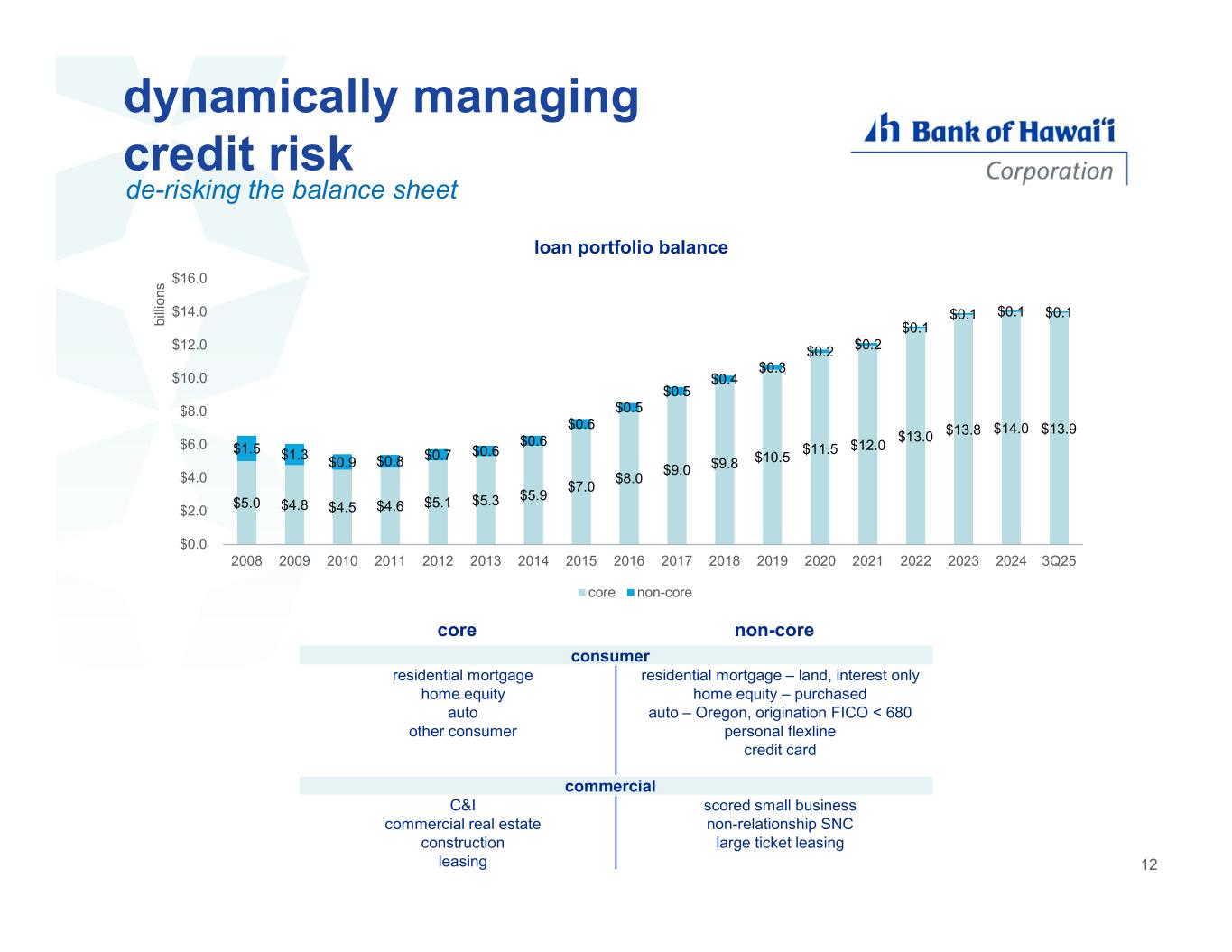 $5.0 $4.8 $4.5 $4.6 $5.1 $5.3 $5.9 $7.0 $8.0 $9.0 $9.8 $10.5 $11.5 $12.0 $13.0 $13.8 $14.0 $13.9 $1.5 $1.3 $0.9 $0.8 $0.7 $0.6 $0.6 $0.6 $0.5 $0.5 $0.4 $0.3 $0.2 $0.2 $0.1 $0.1 $0.1 $0.1 $0.0 $2.0 $4.0 $6.0 $8.0 $10.0 $12.0 $14.0 $16.0 2008 2009 2010 2011 2012 2013 2014 2015 2016 2017 2018 2019 2020 2021 2022 2023 2024 3Q25 b ill io n s loan portfolio balance core non-core non-corecore consumer residential mortgage – land, interest only home equity – purchased auto – Oregon, origination FICO < 680 personal flexline credit card residential mortgage home equity auto other consumer commercial scored small business non-relationship SNC large ticket leasing C&I commercial real estate construction leasing dynamically managing credit risk de-risking the balance sheet 12