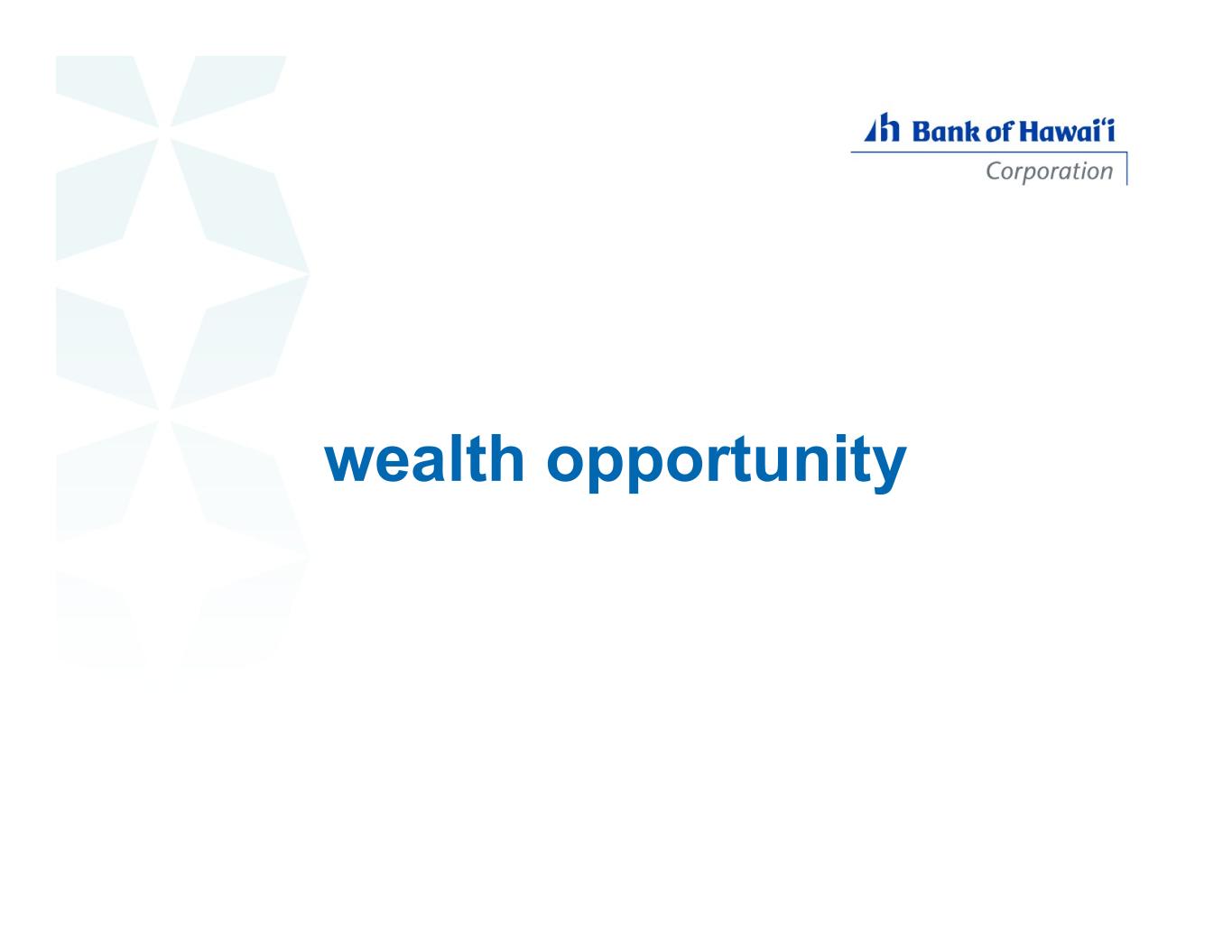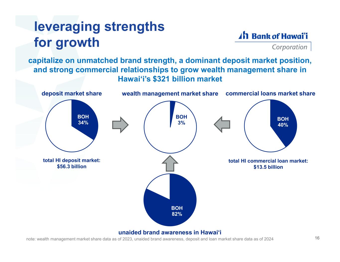 leveraging strengths for growth note: wealth management market share data as of 2023, unaided brand awareness, deposit and loan market share data as of 2024 BOH 82% oth er capitalize on unmatched brand strength, a dominant deposit market position, and strong commercial relationships to grow wealth management share in Hawaiʻi’s $321 billion market total HI deposit market: $56.3 billion BOH 34% deposit market share unaided brand awareness in Hawaiʻi BOH 3% wealth management market share BOH 40% total HI commercial loan market: $13.5 billion commercial loans market share 16