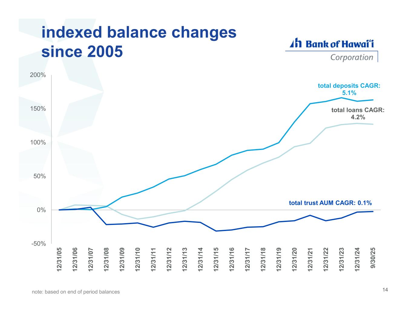 indexed balance changes since 2005 note: based on end of period balances total loans CAGR: 4.2% total deposits CAGR: 5.1% -50% 0% 50% 100% 150% 200% 1 2/ 3 1/ 0 5 1 2/ 3 1/ 0 6 1 2/ 3 1/ 0 7 1 2/ 3 1/ 0 8 1 2/ 3 1/ 0 9 1 2/ 3 1/ 1 0 1 2/ 3 1/ 1 1 1 2/ 3 1/ 1 2 1 2/ 3 1/ 1 3 1 2/ 3 1/ 1 4 1 2/ 3 1/ 1 5 1 2/ 3 1/ 1 6 1 2/ 3 1/ 1 7 1 2/ 3 1/ 1 8 1 2/ 3 1/ 1 9 1 2/ 3 1/ 2 0 1 2/ 3 1/ 2 1 1 2/ 3 1/ 2 2 1 2/ 3 1/ 2 3 1 2/ 3 1/ 2 4 9 /3 0 /2 5 total trust AUM CAGR: 0.1% 14