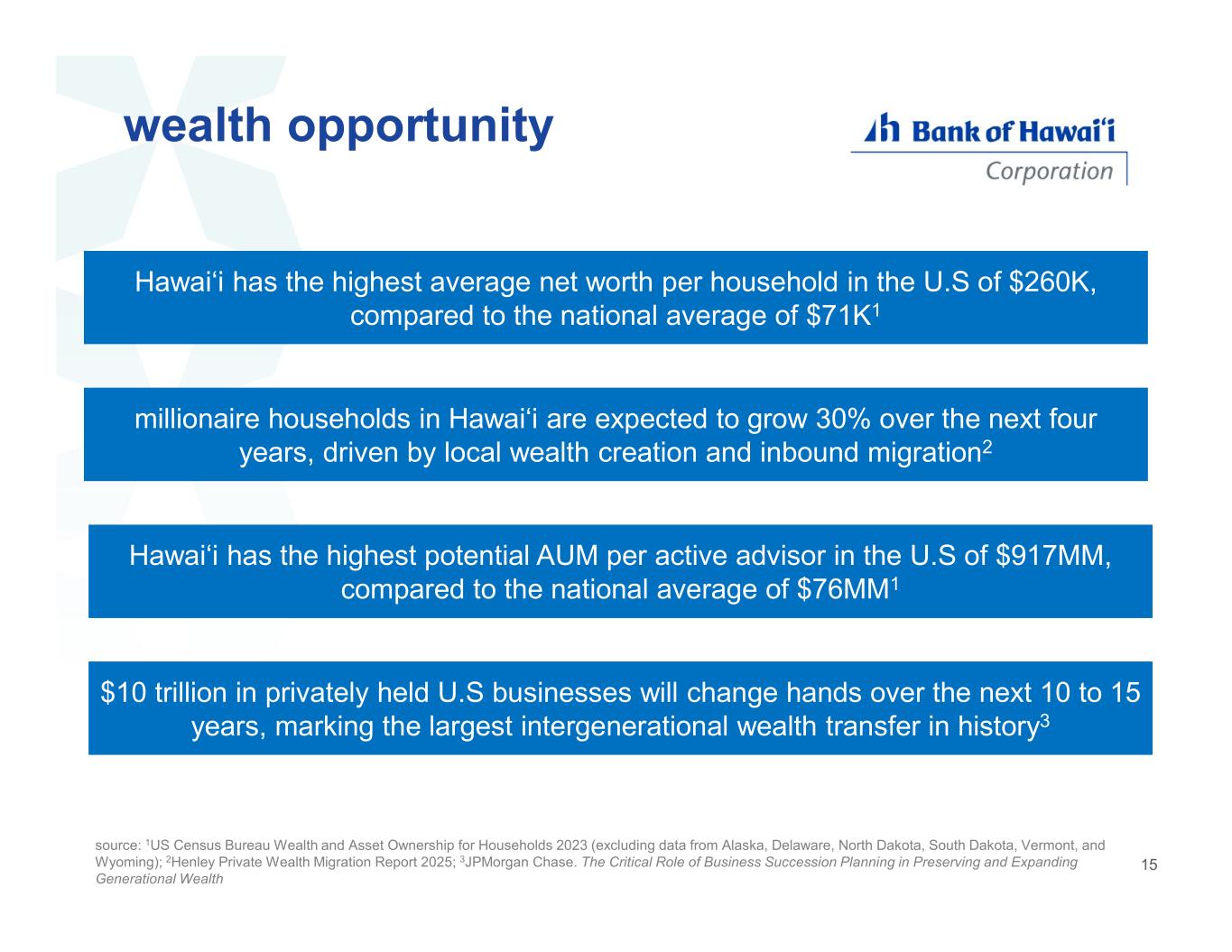 wealth opportunity Hawaiʻi has the highest average net worth per household in the U.S of $260K, compared to the national average of $71K1 source: 1US Census Bureau Wealth and Asset Ownership for Households 2023 (excluding data from Alaska, Delaware, North Dakota, South Dakota, Vermont, and Wyoming); 2Henley Private Wealth Migration Report 2025; 3JPMorgan Chase. The Critical Role of Business Succession Planning in Preserving and Expanding Generational Wealth millionaire households in Hawaiʻi are expected to grow 30% over the next four years, driven by local wealth creation and inbound migration2 Hawaiʻi has the highest potential AUM per active advisor in the U.S of $917MM, compared to the national average of $76MM1 $10 trillion in privately held U.S businesses will change hands over the next 10 to 15 years, marking the largest intergenerational wealth transfer in history3 15