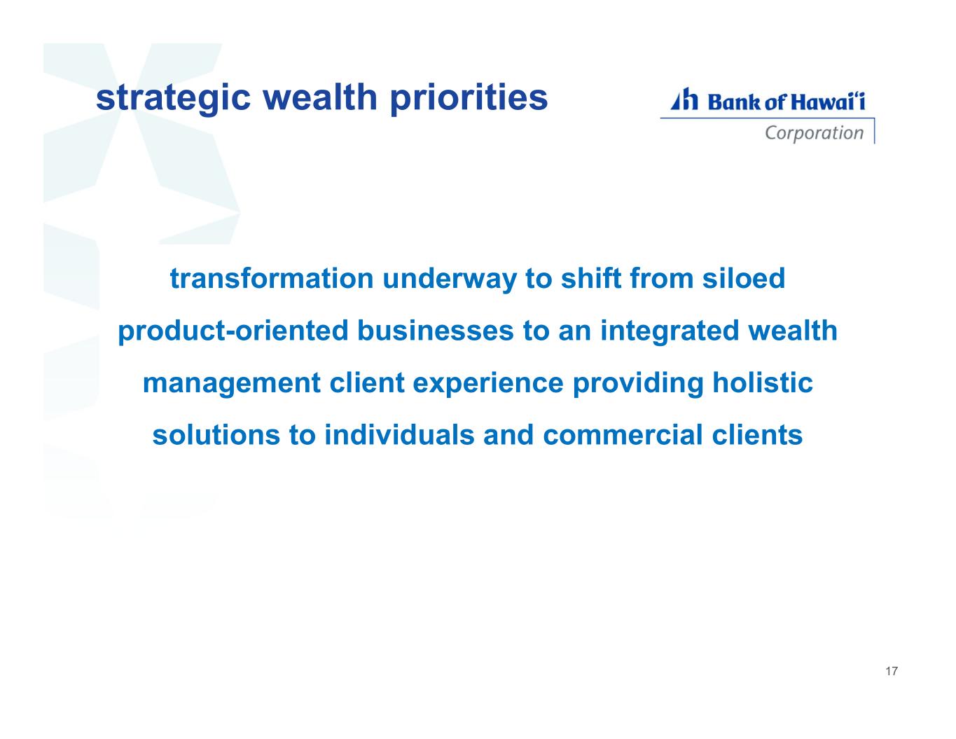 transformation underway to shift from siloed product-oriented businesses to an integrated wealth management client experience providing holistic solutions to individuals and commercial clients strategic wealth priorities 17