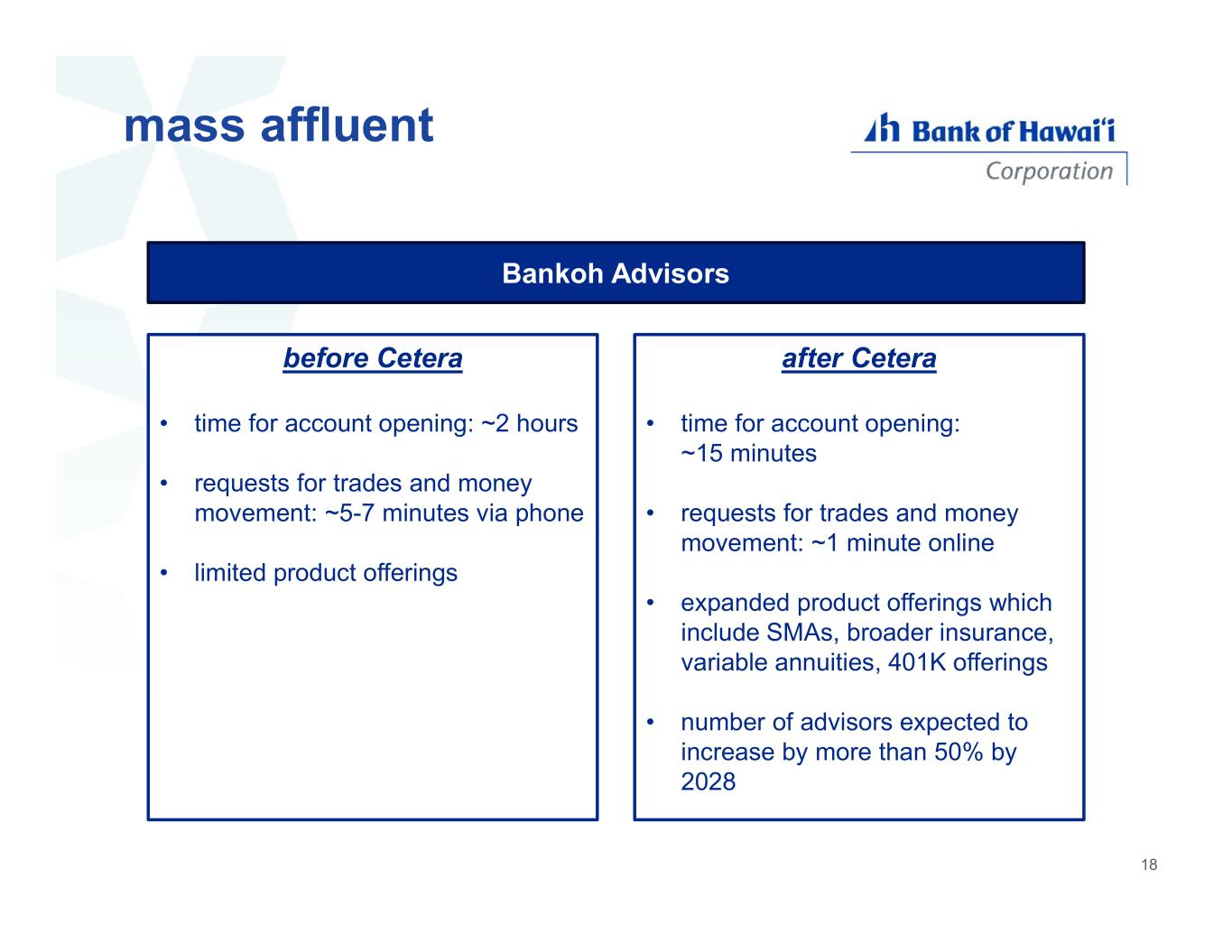 mass affluent Bankoh Advisors before Cetera • time for account opening: ~2 hours • requests for trades and money movement: ~5-7 minutes via phone • limited product offerings after Cetera • time for account opening: ~15 minutes • requests for trades and money movement: ~1 minute online • expanded product offerings which include SMAs, broader insurance, variable annuities, 401K offerings • number of advisors expected to increase by more than 50% by 2028 18