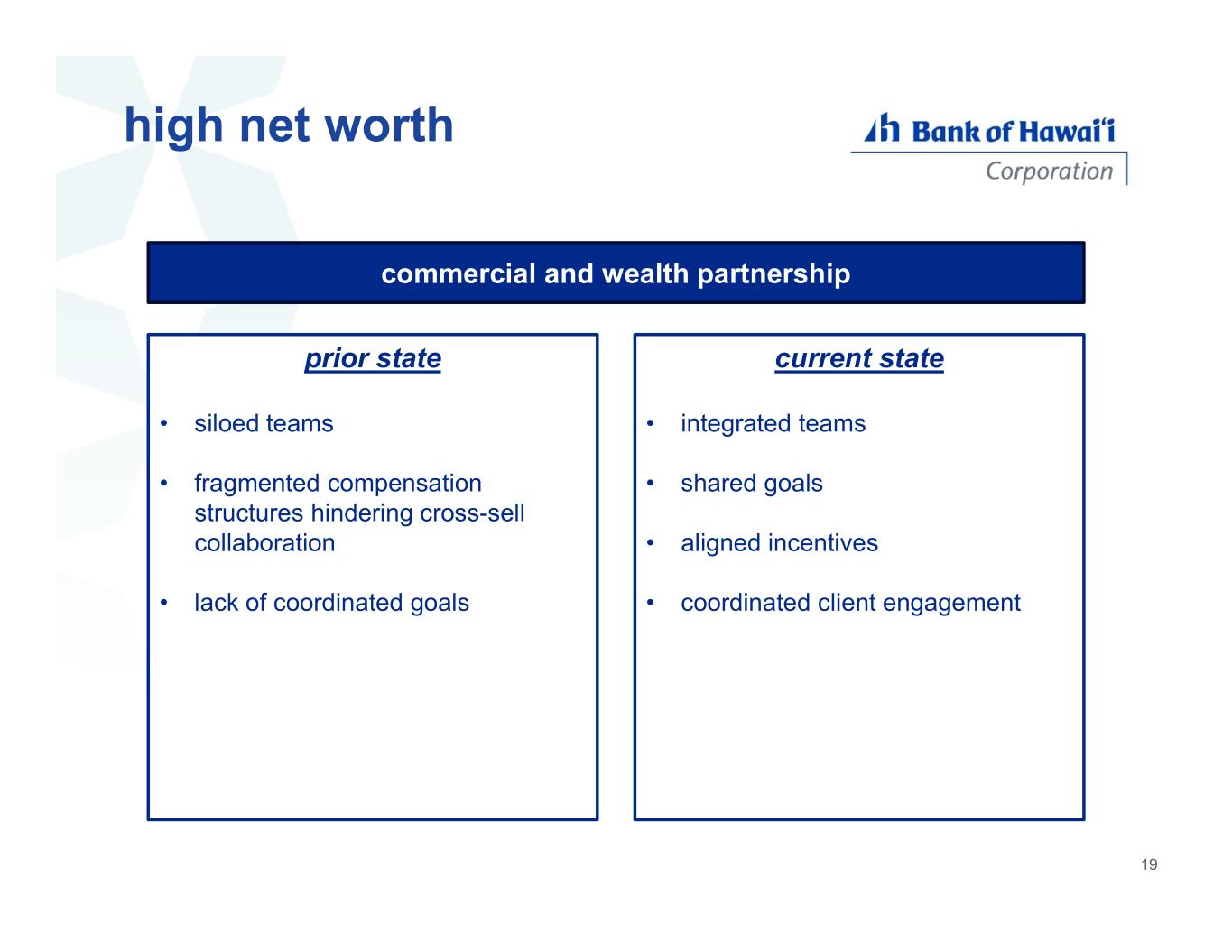 high net worth commercial and wealth partnership prior state • siloed teams • fragmented compensation structures hindering cross-sell collaboration • lack of coordinated goals current state • integrated teams • shared goals • aligned incentives • coordinated client engagement 19
