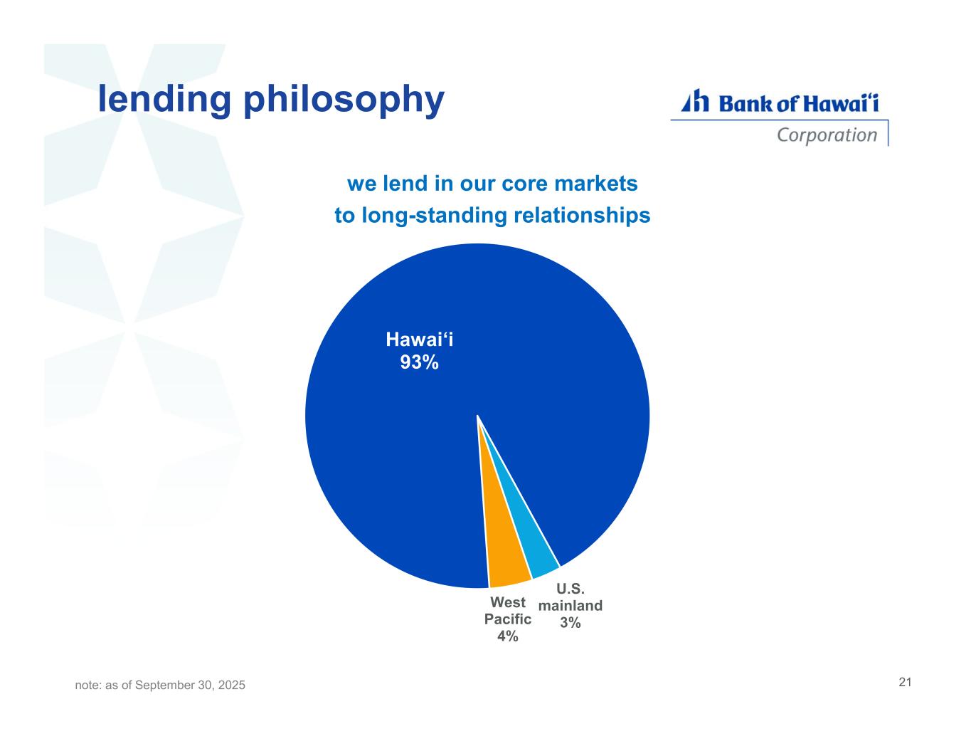 lending philosophy Hawaiʻi 93% U.S. mainland 3% West Pacific 4% we lend in our core markets to long-standing relationships note: as of September 30, 2025 21