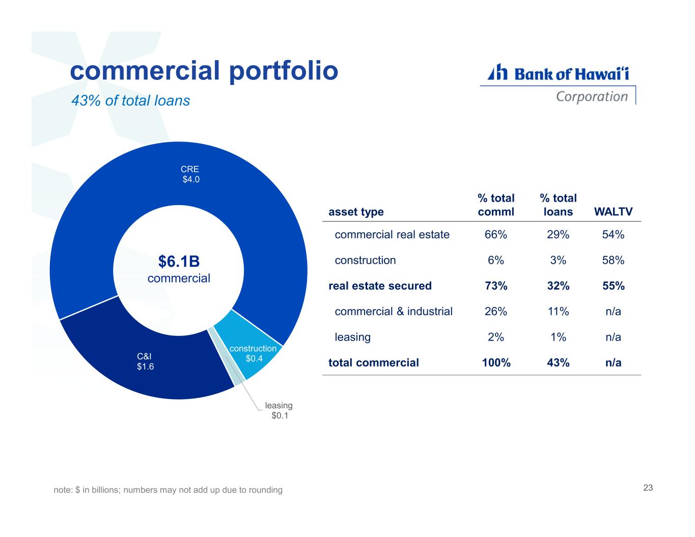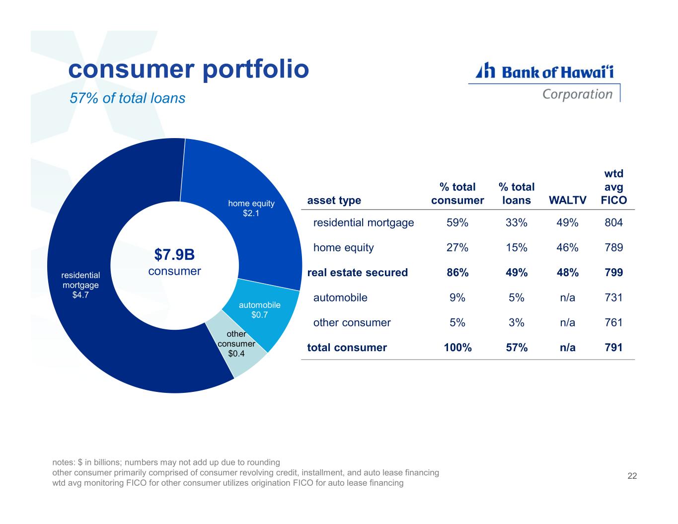 residential mortgage $4.7 home equity $2.1 automobile $0.7 other consumer $0.4 consumer portfolio wtd avg FICOWALTV % total loans % total consumerasset type 80449%33%59%residential mortgage 78946%15%27%home equity 79948%49%86%real estate secured 731n/a5%9%automobile 761n/a3%5%other consumer 791n/a57%100%total consumer $7.9B consumer notes: $ in billions; numbers may not add up due to rounding other consumer primarily comprised of consumer revolving credit, installment, and auto lease financing wtd avg monitoring FICO for other consumer utilizes origination FICO for auto lease financing 57% of total loans 22