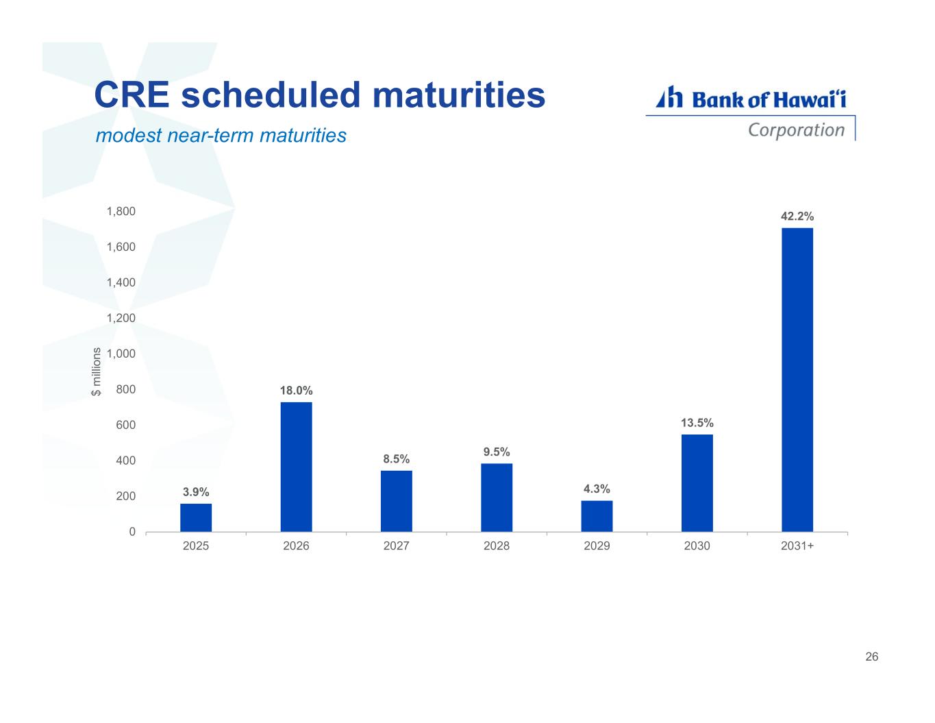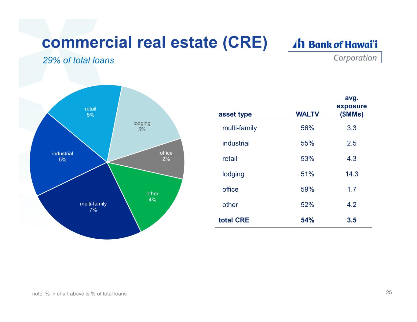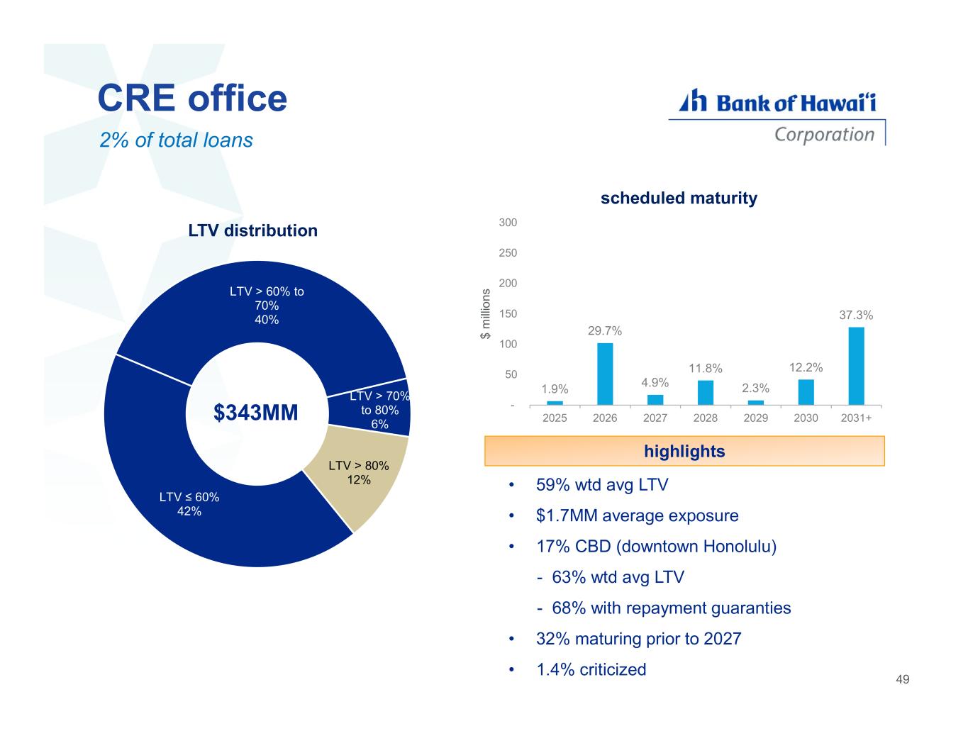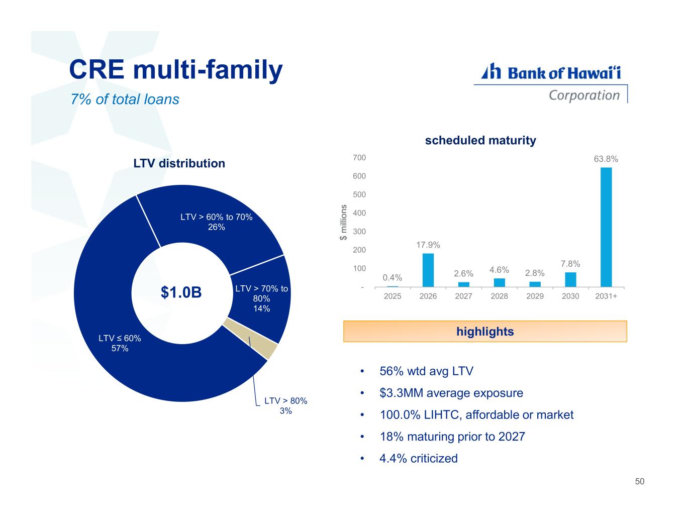 CRE office 2% of total loans • 59% wtd avg LTV • $1.7MM average exposure • 17% CBD (downtown Honolulu) - 63% wtd avg LTV - 68% with repayment guaranties • 32% maturing prior to 2027 • 1.4% criticized highlights LTV ≤ 60% 42% LTV > 60% to 70% 40% LTV > 70% to 80% 6% LTV > 80% 12% LTV distribution $343MM 49 1.9% 29.7% 4.9% 11.8% 2.3% 12.2% 37.3% - 50 100 150 200 250 300 2025 2026 2027 2028 2029 2030 2031+ $ m ill io ns scheduled maturity