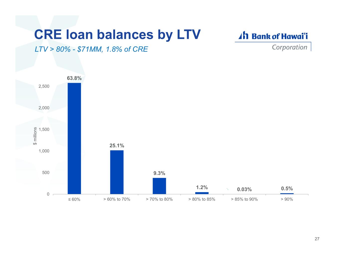 CRE scheduled maturities 3.9% 18.0% 8.5% 9.5% 4.3% 13.5% 42.2% 0 200 400 600 800 1,000 1,200 1,400 1,600 1,800 2025 2026 2027 2028 2029 2030 2031+ $ m ill io ns modest near-term maturities 26