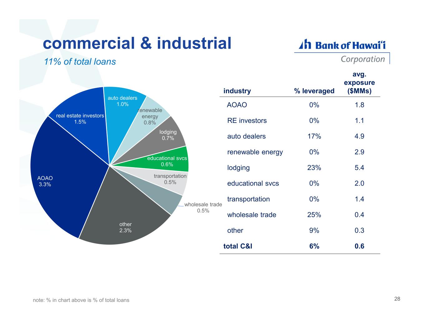 commercial & industrial residential mortgage home equity 11% of total loans AOAO 3.3% real estate investors 1.5% auto dealers 1.0% renewable energy 0.8% lodging 0.7% educational svcs 0.6% transportation 0.5% wholesale trade 0.5% other 2.3% avg. exposure ($MMs)% leveragedindustry 1.80%AOAO 1.10%RE investors 4.917%auto dealers 2.90%renewable energy 5.423%lodging 2.00%educational svcs 1.40%transportation 0.425%wholesale trade 0.39%other 0.66%total C&I note: % in chart above is % of total loans 28