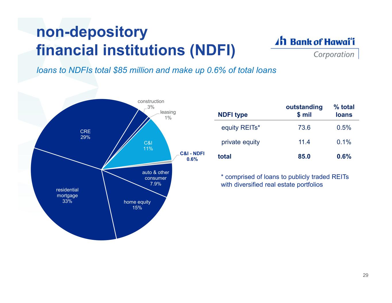 non-depository financial institutions (NDFI) CRE C&I residential mortgage auto CRE 29% construction 3% leasing 1% C&I 11% C&I - NDFI 0.6% auto & other consumer 7.9% home equity 15% residential mortgage 33% loans to NDFIs total $85 million and make up 0.6% of total loans % total loans outstanding $ milNDFI type 0.5%73.6equity REITs* 0.1%11.4private equity 0.6%85.0total * comprised of loans to publicly traded REITs with diversified real estate portfolios 29