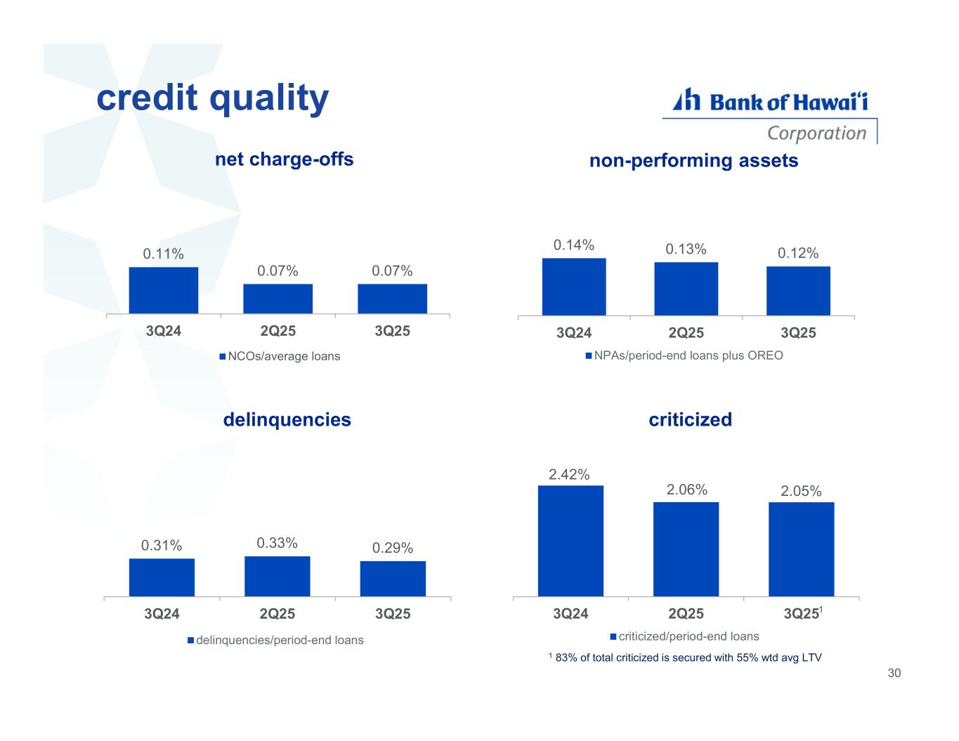 credit quality 0.11% 0.07% 0.07% $0 $0 $0 $0 $0 $0 $0 $0 $0 3Q24 2Q25 3Q25 net charge-offs NCOs/average loans 0.14% 0.13% 0.12% 0.00% 0.05% 0.10% 0.15% 0.20% 0.25% 0.30% 0.35% 0.40% 3Q24 2Q25 3Q25 non-performing assets NPAs/period-end loans plus OREO 1 83% of total criticized is secured with 55% wtd avg LTV 0.31% 0.33% 0.29% 0.00% 0.20% 0.40% 0.60% 0.80% 1.00% 1.20% 1.40% 3Q24 2Q25 3Q25 delinquencies delinquencies/period-end loans 2.42% 2.06% 2.05% 3Q24 2Q25 3Q25 criticized criticized/period-end loans 1 30