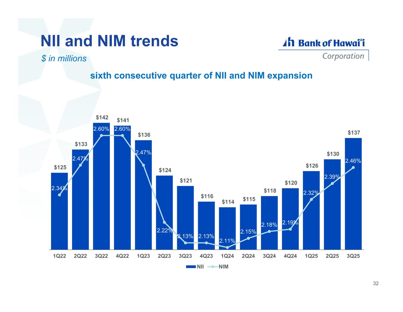 NII and NIM trends sixth consecutive quarter of NII and NIM expansion $ in millions $125 $133 $142 $141 $136 $124 $121 $116 $114 $115 $118 $120 $126 $130 $137 2.34% 2.47% 2.60% 2.60% 2.47% 2.22% 2.13% 2.13% 2.11% 2.15% 2.18% 2.19% 2.32% 2.39% 2.46% 1Q22 2Q22 3Q22 4Q22 1Q23 2Q23 3Q23 4Q23 1Q24 2Q24 3Q24 4Q24 1Q25 2Q25 3Q25 NII NIM 32
