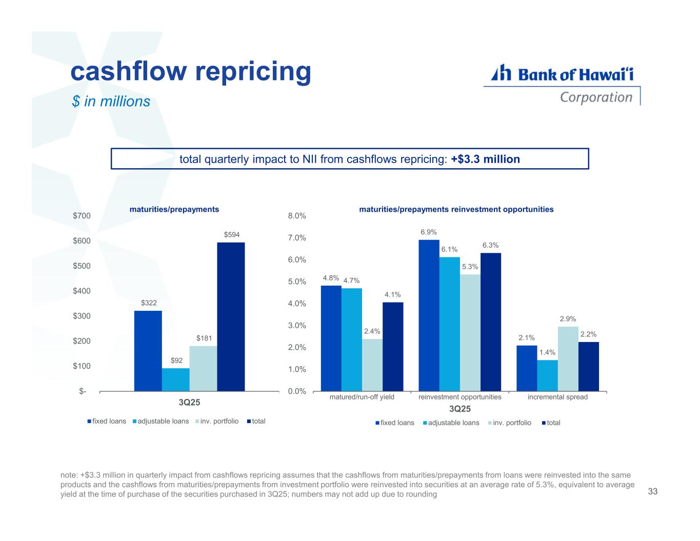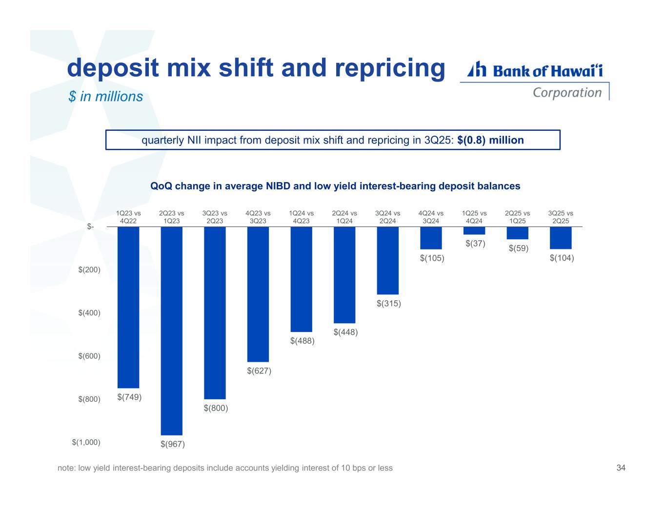 cashflow repricing total quarterly impact to NII from cashflows repricing: +$3.3 million note: +$3.3 million in quarterly impact from cashflows repricing assumes that the cashflows from maturities/prepayments from loans were reinvested into the same products and the cashflows from maturities/prepayments from investment portfolio were reinvested into securities at an average rate of 5.3%, equivalent to average yield at the time of purchase of the securities purchased in 3Q25; numbers may not add up due to rounding 4.8% 6.9% 2.1% 4.7% 6.1% 1.4% 2.4% 5.3% 2.9% 4.1% 6.3% 2.2% 0.0% 1.0% 2.0% 3.0% 4.0% 5.0% 6.0% 7.0% 8.0% matured/run-off yield reinvestment opportunities incremental spread 3Q25 maturities/prepayments reinvestment opportunities fixed loans adjustable loans inv. portfolio total $322 $92 $181 $594 $- $100 $200 $300 $400 $500 $600 $700 3Q25 maturities/prepayments fixed loans adjustable loans inv. portfolio total 33 $ in millions