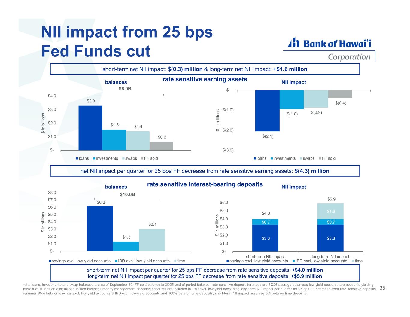 deposit mix shift and repricing quarterly NII impact from deposit mix shift and repricing in 3Q25: $(0.8) million $(749) $(967) $(800) $(627) $(488) $(448) $(315) $(105) $(37) $(59) $(104) $(1,000) $(800) $(600) $(400) $(200) $- 1Q23 vs 4Q22 2Q23 vs 1Q23 3Q23 vs 2Q23 4Q23 vs 3Q23 1Q24 vs 4Q23 2Q24 vs 1Q24 3Q24 vs 2Q24 4Q24 vs 3Q24 1Q25 vs 4Q24 2Q25 vs 1Q25 3Q25 vs 2Q25 QoQ change in average NIBD and low yield interest-bearing deposit balances note: low yield interest-bearing deposits include accounts yielding interest of 10 bps or less 34 $ in millions