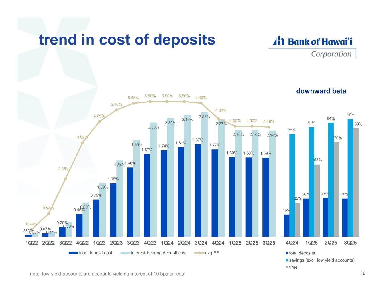 35 NII impact from 25 bps Fed Funds cut net NII impact per quarter for 25 bps FF decrease from rate sensitive earning assets: $(4.3) million short-term net NII impact per quarter for 25 bps FF decrease from rate sensitive deposits: +$4.0 million long-term net NII impact per quarter for 25 bps FF decrease from rate sensitive deposits: +$5.9 million short-term net NII impact: $(0.3) million & long-term net NII impact: +$1.6 million note: loans, investments and swap balances are as of September 30; FF sold balance is 3Q25 end of period balance; rate sensitive deposit balances are 3Q25 average balances; low-yield accounts are accounts yielding interest of 10 bps or less; all of qualified business money management checking accounts are included in ‘IBD excl. low-yield accounts’; long-term NII impact per quarter for 25 bps FF decrease from rate sensitive deposits assumes 85% beta on savings excl. low-yield accounts & IBD excl. low-yield accounts and 100% beta on time deposits; short-term NII impact assumes 0% beta on time deposits rate sensitive earning assets rate sensitive interest-bearing deposits $3.3 $1.5 $1.4 $0.6 $- $1.0 $2.0 $3.0 $4.0 $ in b ill io ns loans investments swaps FF sold balances $6.2 $1.3 $3.1 $- $1.0 $2.0 $3.0 $4.0 $5.0 $6.0 $7.0 $8.0 $ in b ill io ns savings excl. low-yield accounts IBD excl. low-yield accounts time $10.6B balances $(2.1) $(1.0) $(0.9) $(0.4) $(3.0) $(2.0) $(1.0) $- $ in m ill io ns loans investments swaps FF sold NII impact $6.9B NII impact $3.3 $3.3 $0.7 $0.7 $1.9 $4.0 $5.9 $- $1.0 $2.0 $3.0 $4.0 $5.0 $6.0 short-term NII impact long-term NII impact $ in m ill io ns savings excl. low yield accounts IBD excl. low-yield accounts time