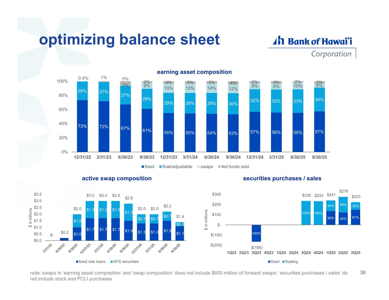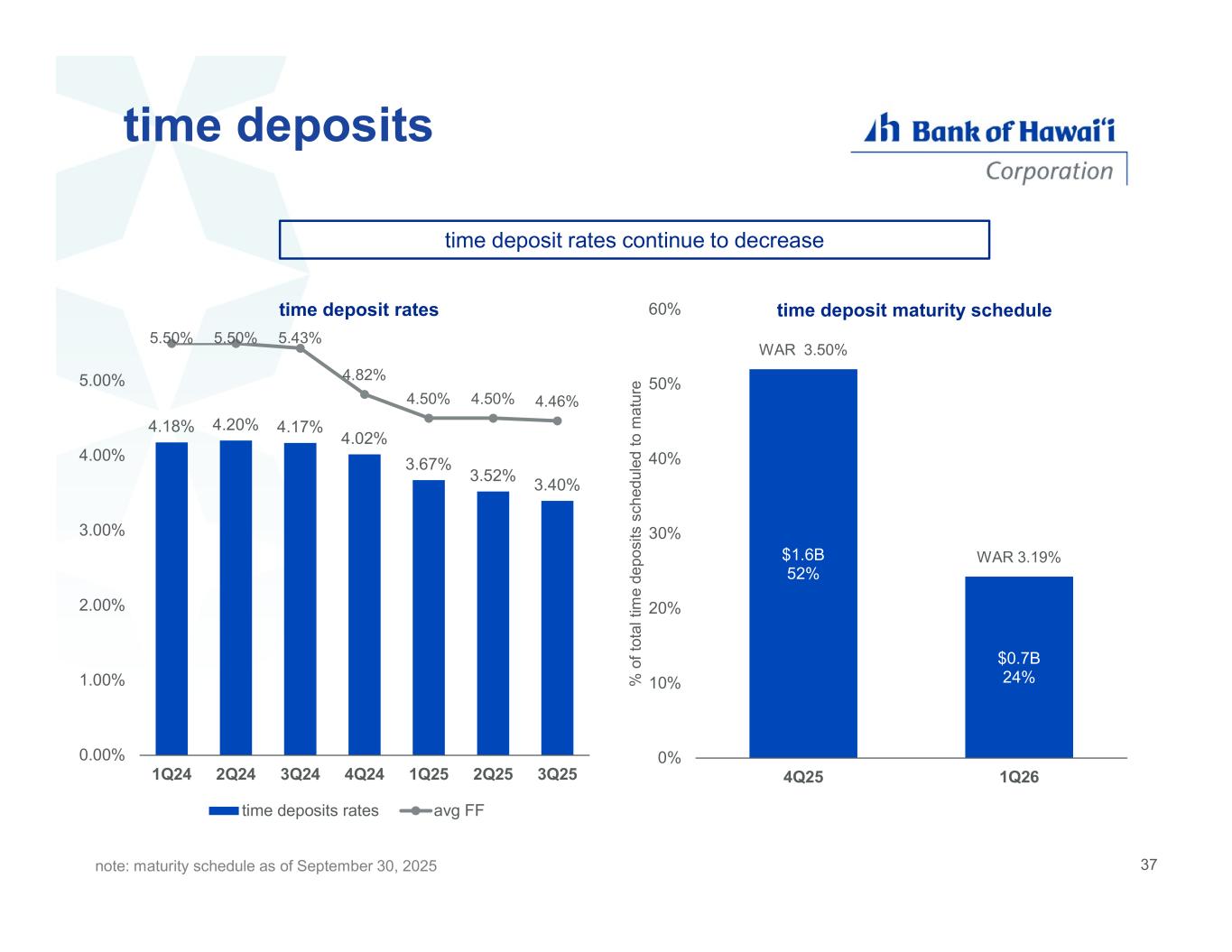 37 time deposits $1.6B 52% $0.7B 24% WAR 3.50% WAR 3.19% 0% 10% 20% 30% 40% 50% 60% 4Q25 1Q26 % o f to ta l t im e de po si ts s ch ed ul ed t o m a tu re time deposit rates continue to decrease note: maturity schedule as of September 30, 2025 4.18% 4.20% 4.17% 4.02% 3.67% 3.52% 3.40% 5.50% 5.50% 5.43% 4.82% 4.50% 4.50% 4.46% 0.00% 1.00% 2.00% 3.00% 4.00% 5.00% 1Q24 2Q24 3Q24 4Q24 1Q25 2Q25 3Q25 time deposits rates avg FF time deposit maturity scheduletime deposit rates