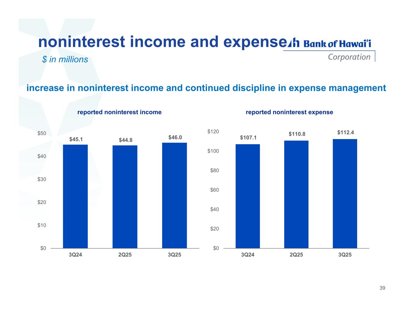 noninterest income and expense $ in millions increase in noninterest income and continued discipline in expense management $45.1 $44.8 $46.0 $0 $10 $20 $30 $40 $50 3Q24 2Q25 3Q25 reported noninterest income $107.1 $110.8 $112.4 $0 $20 $40 $60 $80 $100 $120 3Q24 2Q25 3Q25 reported noninterest expense 39