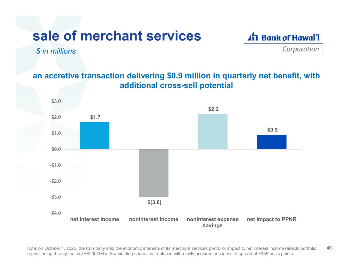 sale of merchant services $1.7 $(3.0) $2.2 $0.9 -$4.0 -$3.0 -$2.0 -$1.0 $0.0 $1.0 $2.0 $3.0 net interest income noninterest income noninterest expense savings net impact to PPNR an accretive transaction delivering $0.9 million in quarterly net benefit, with additional cross-sell potential $ in millions 40note: on October 1, 2025, the Company sold the economic interests of its merchant services portfolio; impact to net interest income reflects portfolio repositioning through sale of ~$200MM in low-yielding securities, replaced with newly acquired securities at spread of ~335 basis points